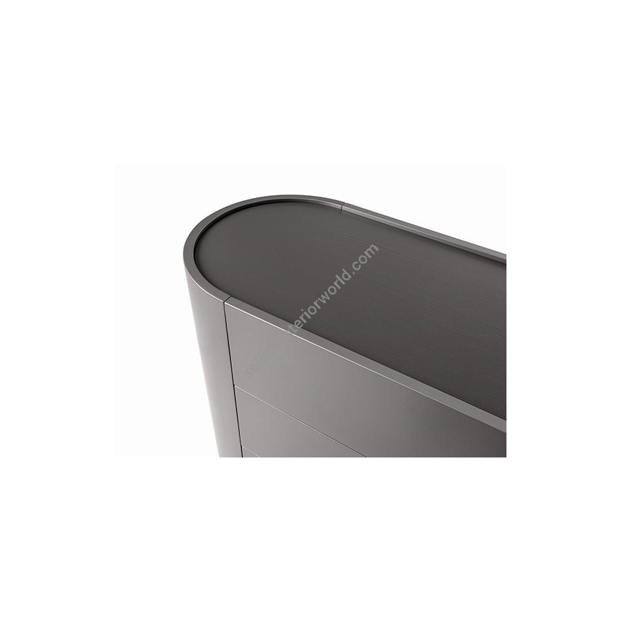 Poplar blockboard structure. Birch plywood drawers with blue motion metal rails. Curved sides in mdf-plated plywood. Countertop in marble, decorated wood or ash veneer. Iron base