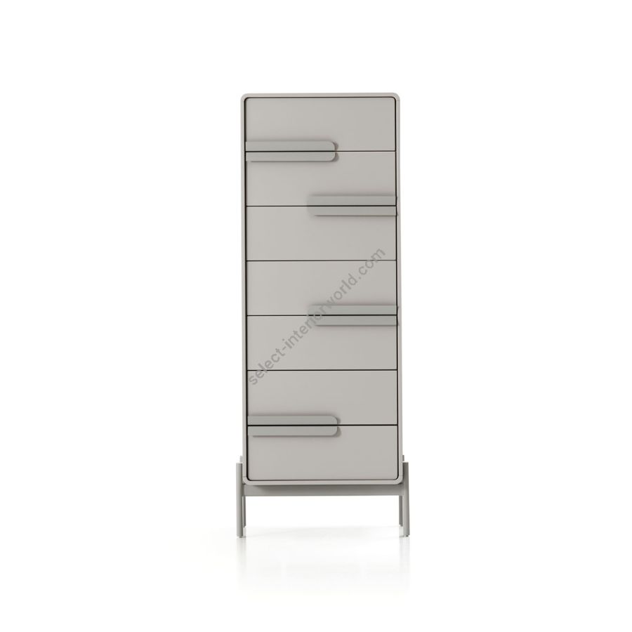 Wooden chest of drawers with 7 drawers with a simple and contemporary line. The rounded shapes of the structure are highlighted by the linearity of the metal handles that form asymmetrical games. The metal base with elliptical section in chromatic combination with the handles, elegantly supports the structure giving it a light and informal look.