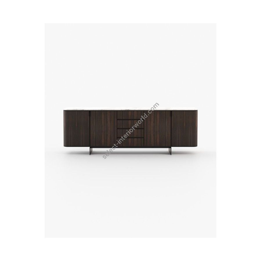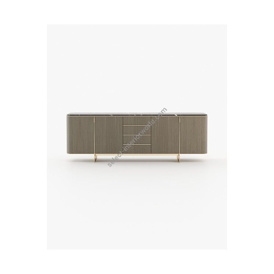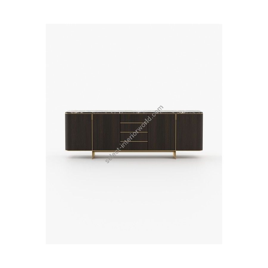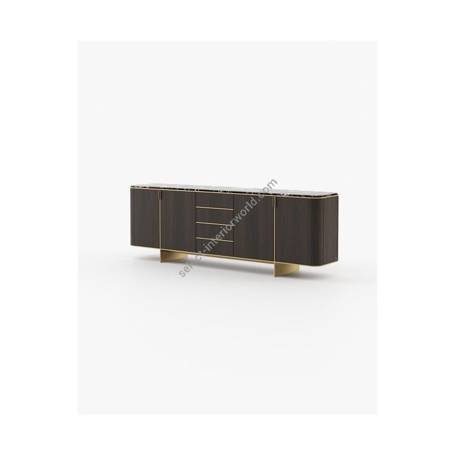 The Dean sideboard is a modern piece with a distinct aesthetic, crafted from wood and featuring rounded edges, sleek feet, and metallic details. It is perfect for storing precious items in a stylish way in any modern living room, bedroom, or large hallway.