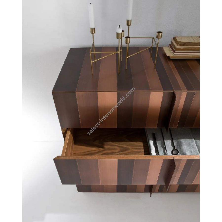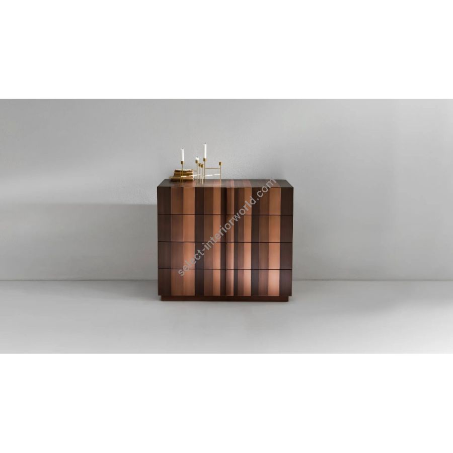Chest of drawers with four drawers and structure covered in a sequence of metal bands. Interior in walnut Colore and plinth in matt black lacquer.