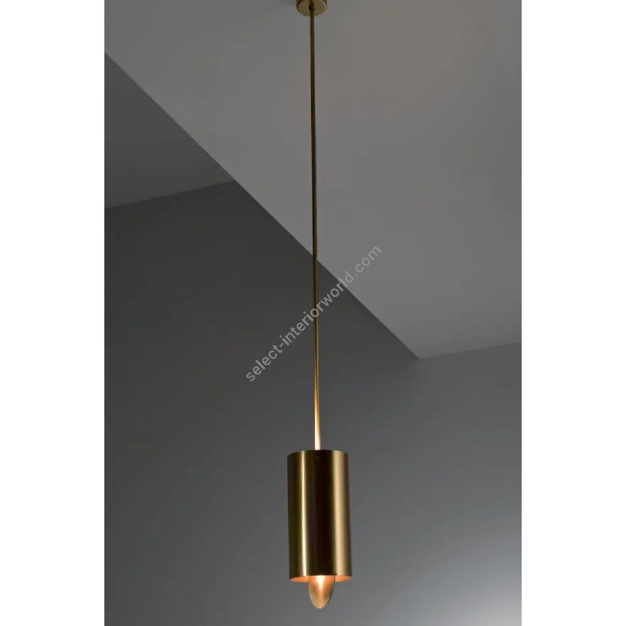 Tubular pendant lamp with satin brass structure and adjustable lower disc.