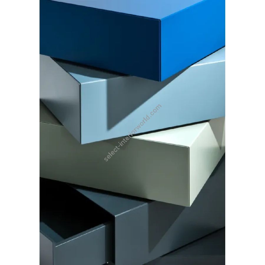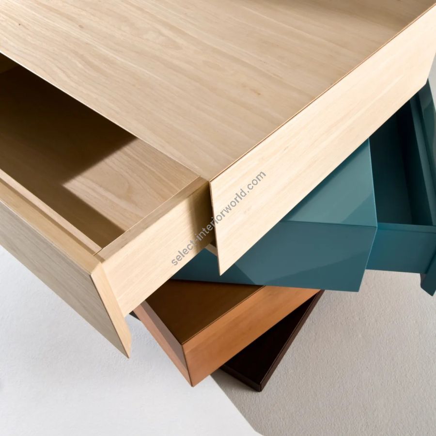 Modules available in all the wood essences of the collection, in dyed wood and in brushed matt lacquered, glossy polyester lacquered or aniline dyed wood in all RAL colours, and in the special liquid velvet finish.