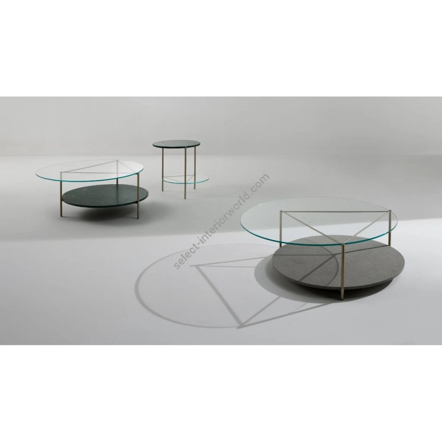 Family of coffee tables with satin brass structure, with an extra-clear glass top and a marble one, available in three sizes.