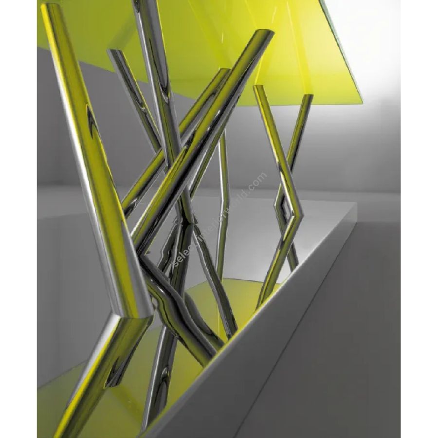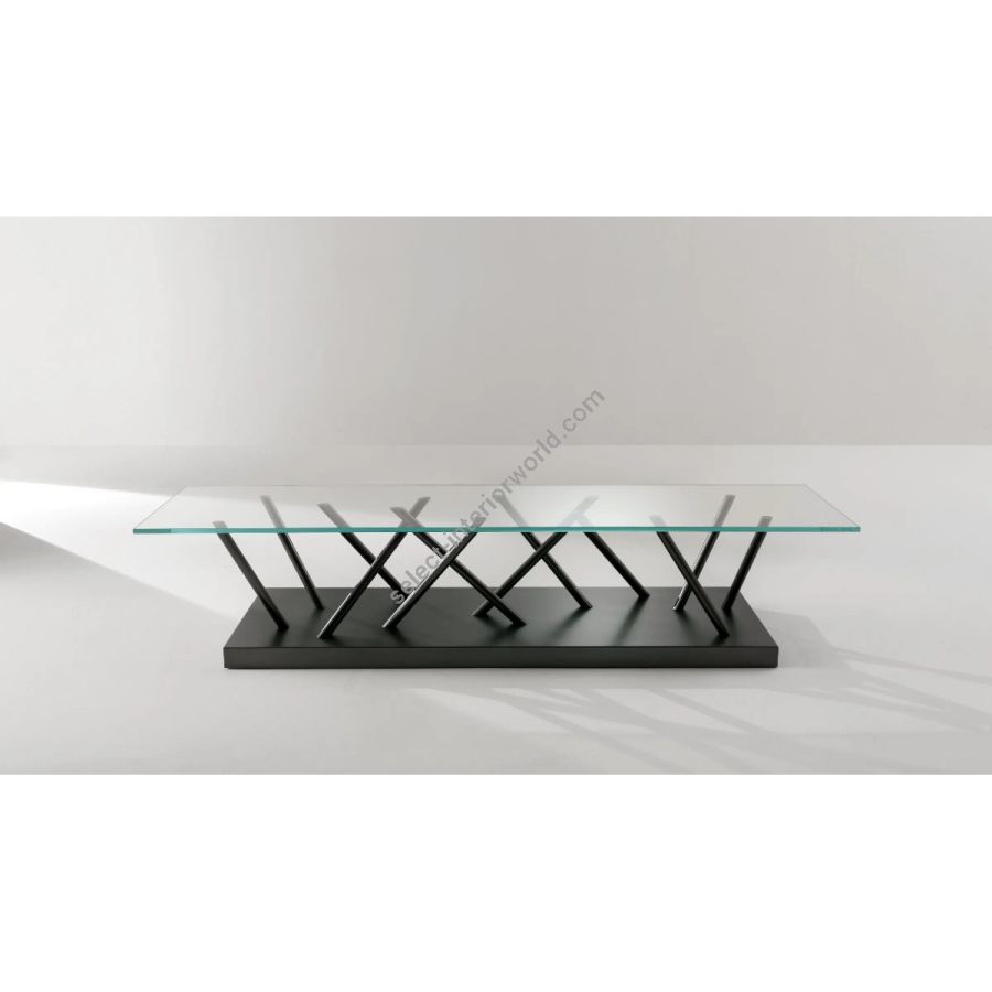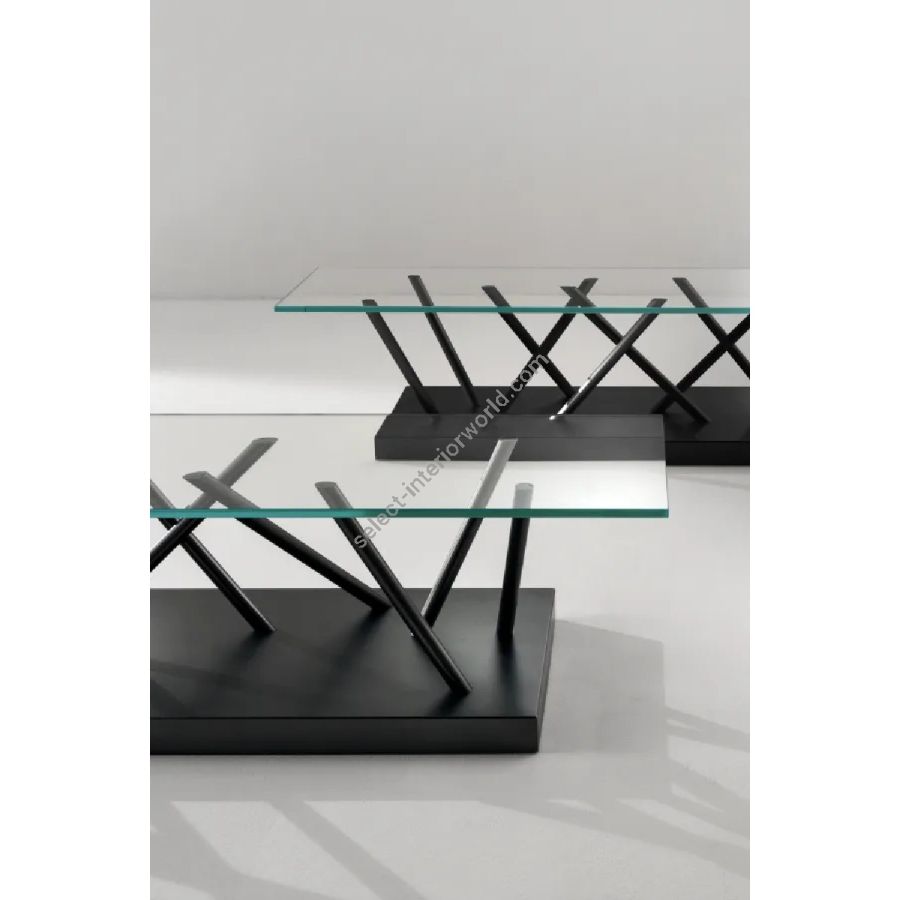 Family of coffee tables with polished steel or pewter finish structure, and extra-clear crystal top.