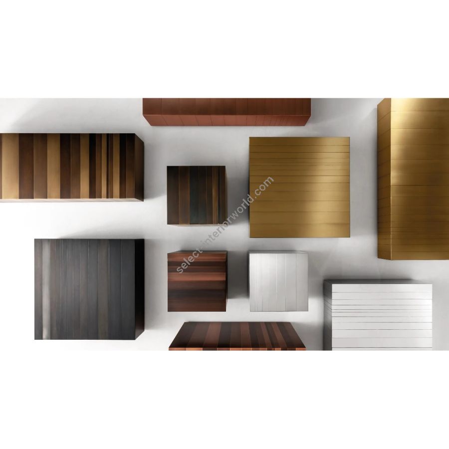 Family of tables entirely covered in a sequence of metal bands, available in various shapes and sizes.