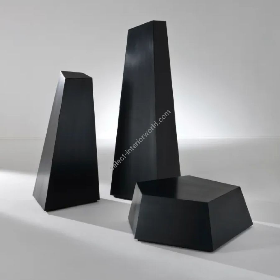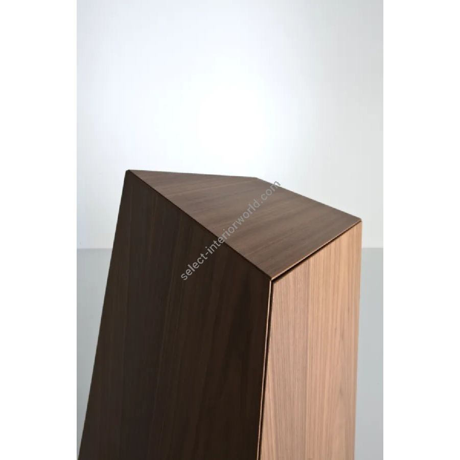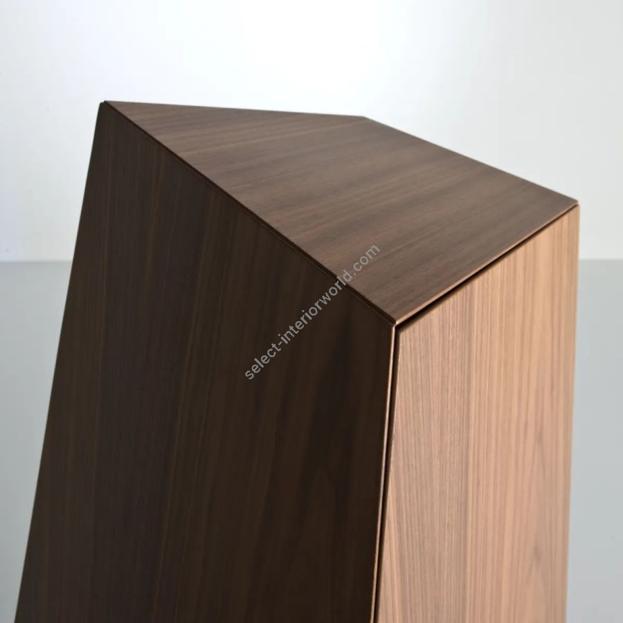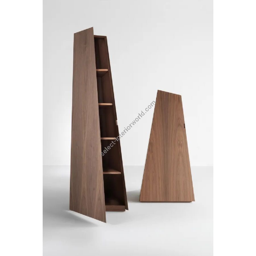 Totem-like units in wood with an unusual shape, available in three sizes, equipped with interiors in brushed matt lacquered wood, fixed shelves or a drawer.