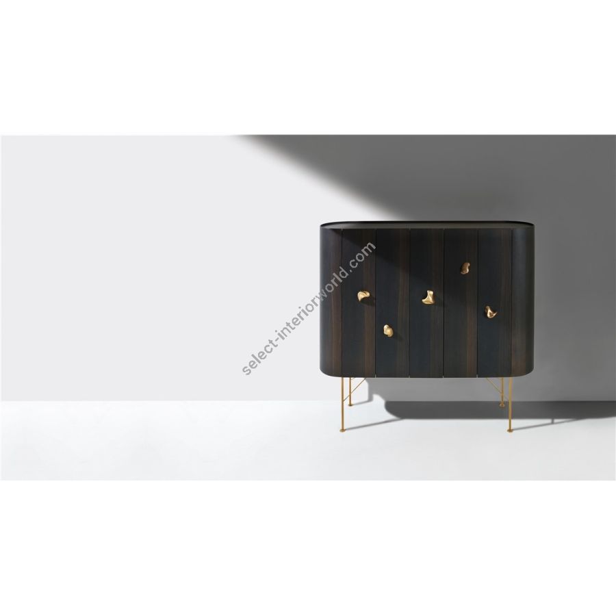 Storage unit with 7 hinged doors and curved sides. Structure finished on all sides in special Syberian Ash wood and legs in satin brass. Equipped with internal shelves and drawers.