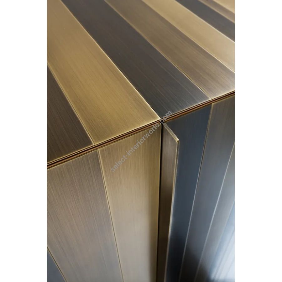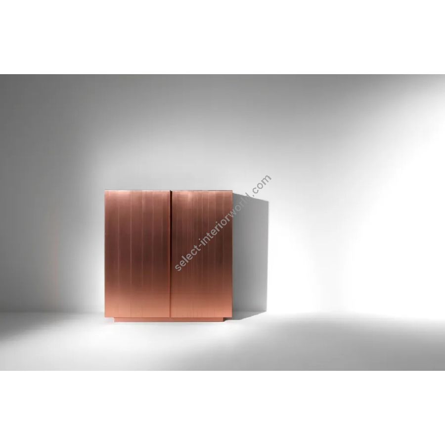 Tall sideboard with hinged doors and structure covered in a sequence of metal strips. Equipped with three internal drawers and a shelf. Interior in walnut Colore and metal plinth.
