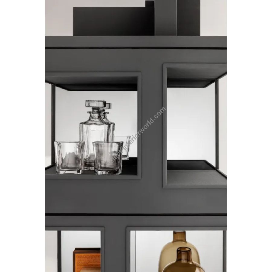 Column made of wood or with a concrete-effect finish, which accommodates a series of removable trays in polished steel, or in concrete-effect, in several compartments made in different sizes.