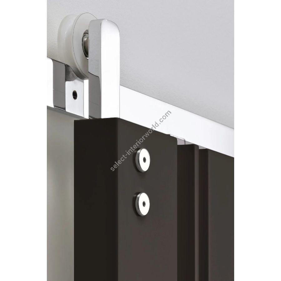 Sliding door featuring wooden panels grooved with channels of various sizes on the visible side and decorated with elliptical blocks. Metal handle carved into the thickness of the door.
