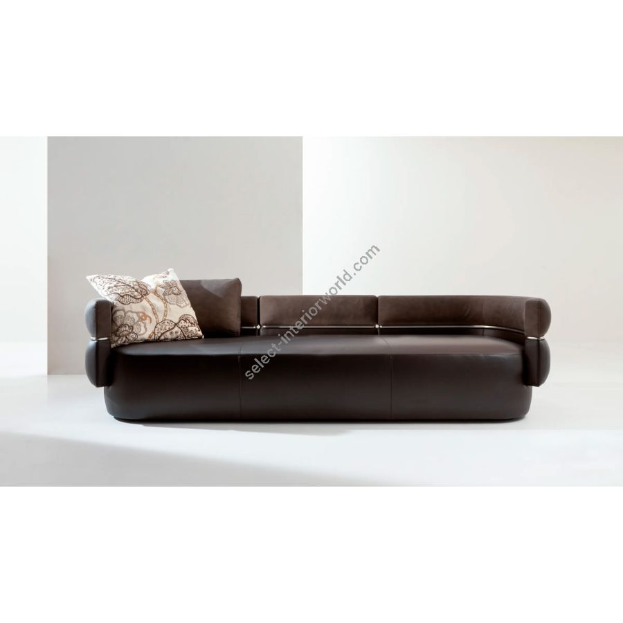 Upholstered sofa available in two- or three-seater versions, both as a dormeuse and as a classic sofa. Featuring a double-padded backrest, customizable with contrasting or tone-on-tone finishes, and enriched by the metal profile between the backrests in Liquid Metal tin finish, Duetto stands out for its architectural presence.