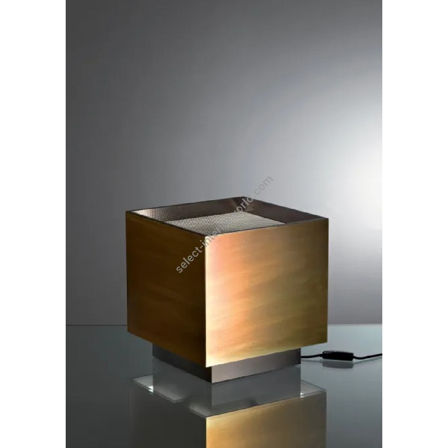 Table lamp with aluminum structure covered in burnished brass sheets and micro-perforated metal diffuser.