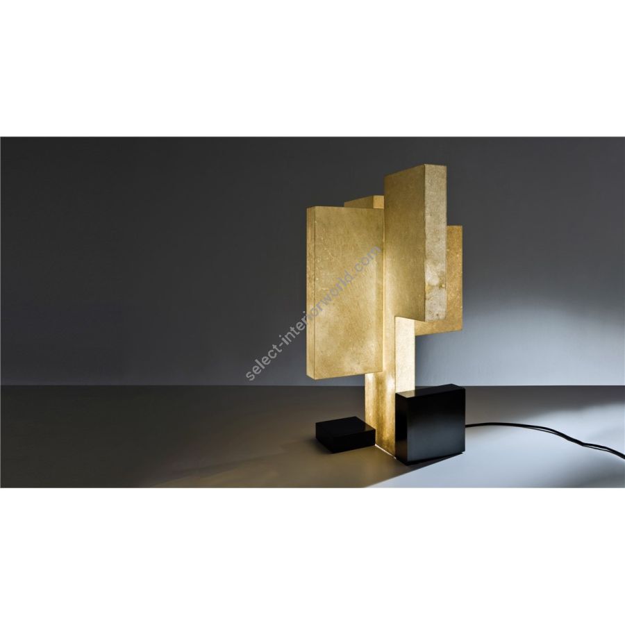 Table lamp with burnished brass base, diffuser covered in goat parchment and four internal LED strips.