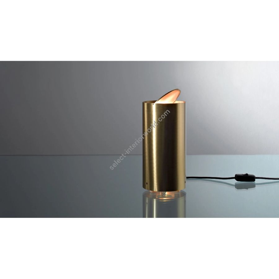 Tubular table lamp with satin brass structure and adjustable upper disc.