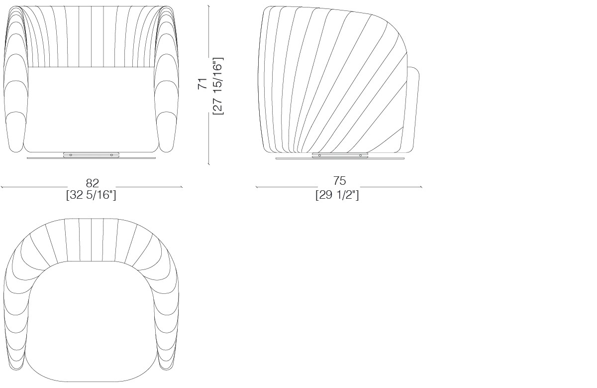 Padded swivel small armchair, covered with a soft drapery. Base in 'Mouse Grey' RAL 7005 lacquered metal.
