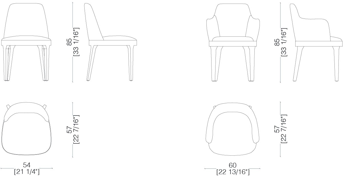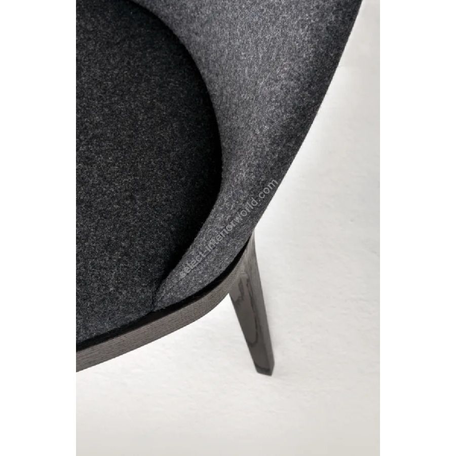 Padded chair with legs in natural, stained or lacquered beech wood, and covered in leather, velvet or fabric.