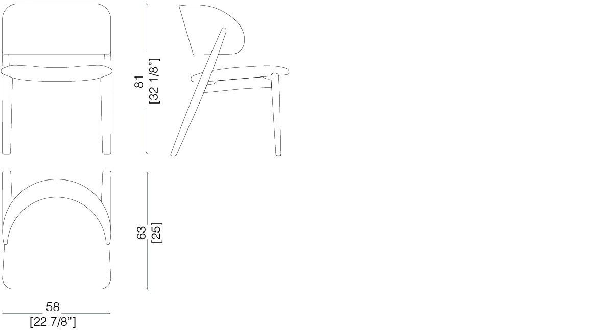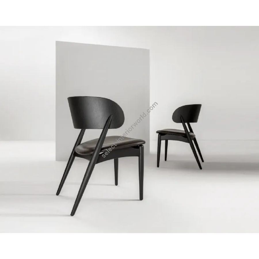 Padded chair with legs in natural, stained or lacquered oak wood, and covered in leather, velvet or fabric.