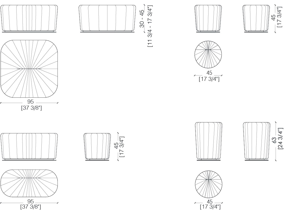 Set of padded poufs, covered with a soft drapery. Base in 'Mouse Grey' RAL 7005 lacquered metal.