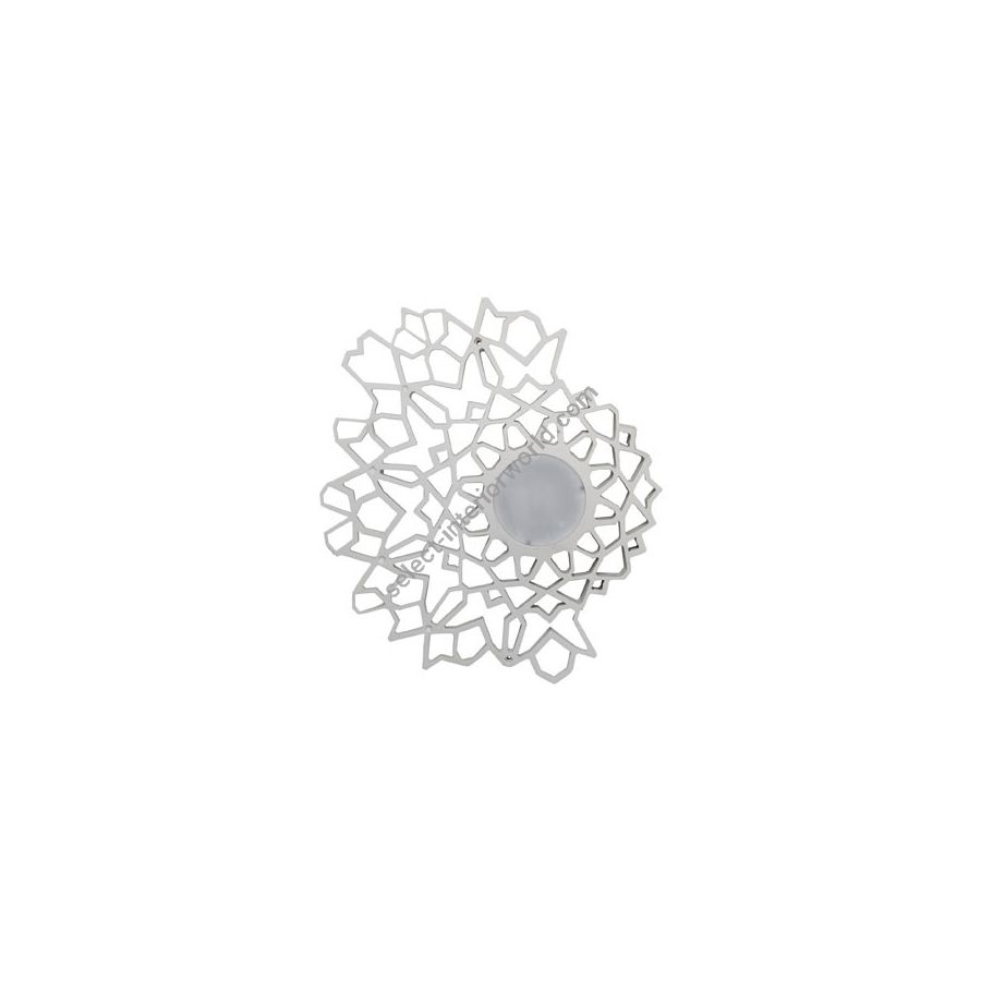 Notredame filters light like that rediating from the beautiful rose windows of a Gothic cathedral. The rosette structure of this highly decorative suspension or wall lamp is made of gold or white technopolymer. The technopolymer can be painted to fit seamlessly into the wall where the lamp is installed, creating a three-dimensional effect. The LED light source sends light directly from the central core and indirectly from the diffuser’s textured backlight. The lamp is available in two sizes and can be wall, ceiling or suspended.