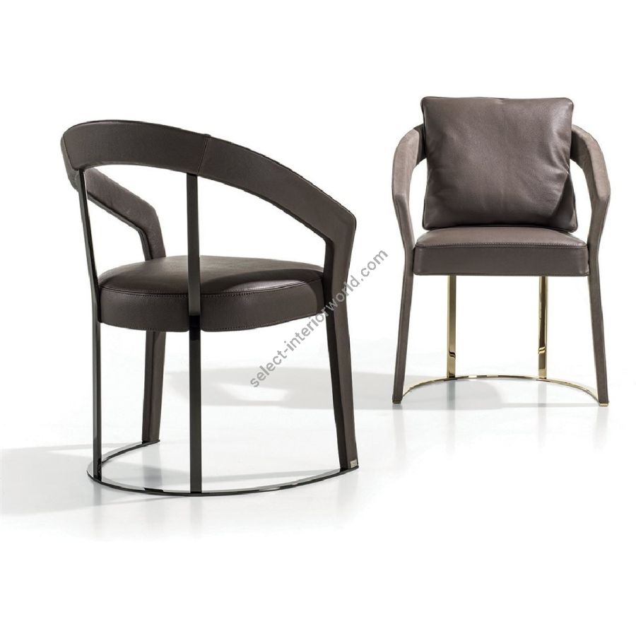 Seat in double density polyurethane foam. Backrest cushion (optional) in sterilised goose down. non-removable upholstery. The frame is in solid ash wood moulded and shaped with CNC machines. Painted withwater-based colors in black, Mink brown, wengé, ebony, walnut or natural ash wood. The base and back rest support are in laser cut ground metal in the finishes: Satin nickel, bright shaded brown, bright light gold, matt Champagne gold, bright chrome, bright black chrome, matt satin bronze, bright pink gold, matt pink gold, Black Rose gold. The moulded structure can be covered in leather in range colours.