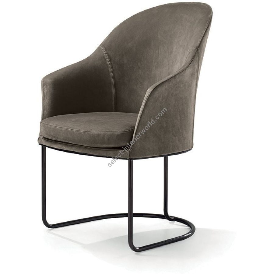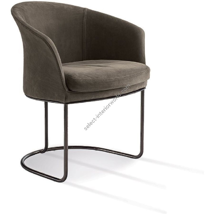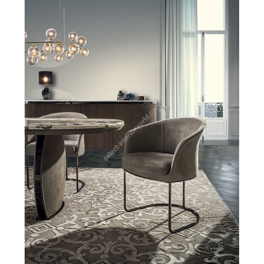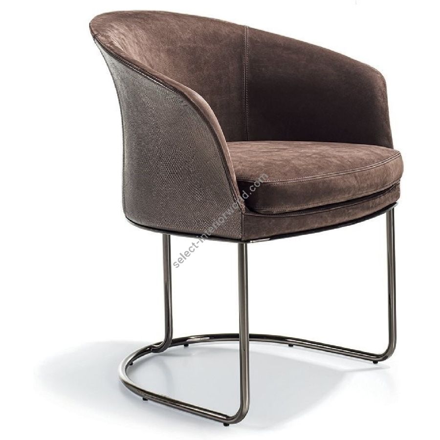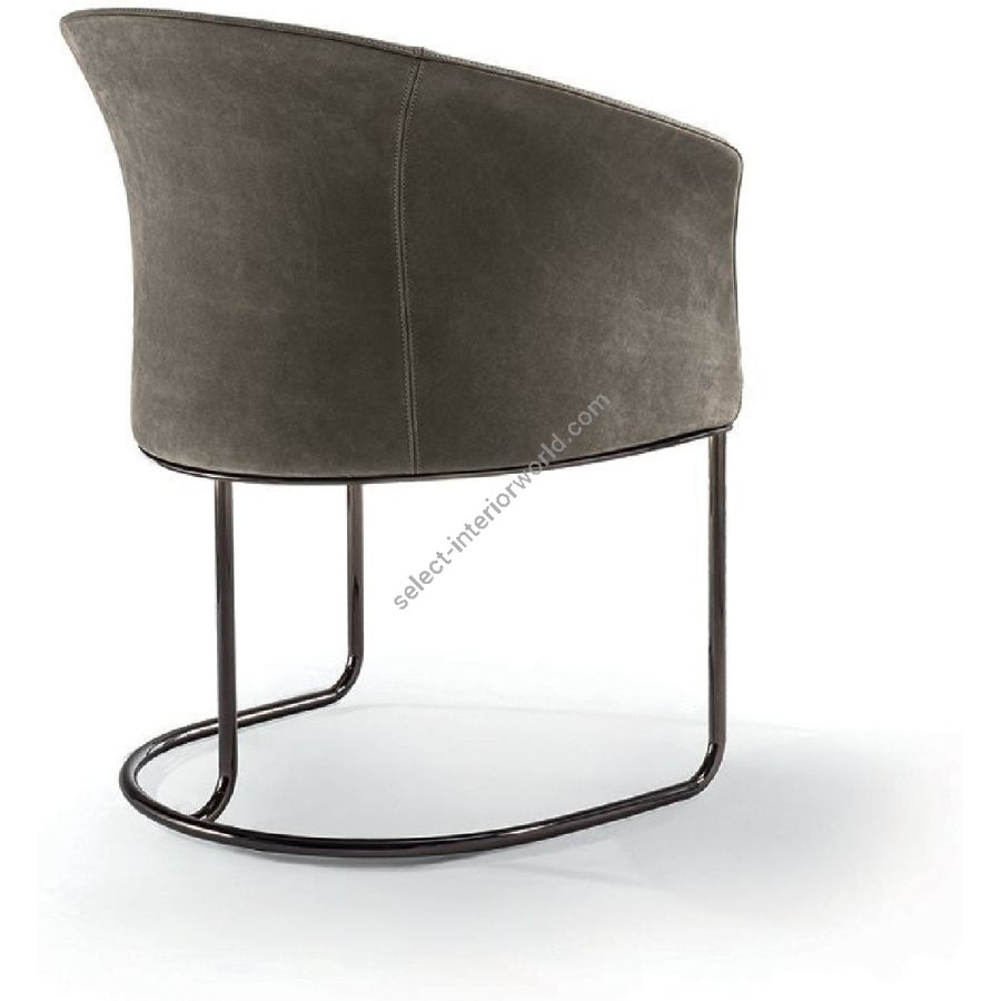 Chair offered in two versions: low backrest and wing-backed. The internal metal structure is cold-mouldedin foam. The seat cushion is in double density polyurethane foam covered in polyester fibre bonded with non-woven fabric. The base is in curved tubular metal assembled with a laser cut metal plate with the following finishes: Satin nickel, bright shaded brown, Black Rose gold, bright light gold, matt Champagne gold, bright chrome, bright black chrome, matt satin bronze, bright pink gold, matt pink gold. The upholstery CANNOT be removed from the structure, but the cushion covers in leather or fabric are removable.