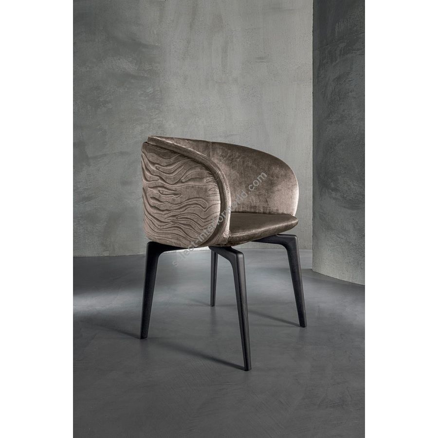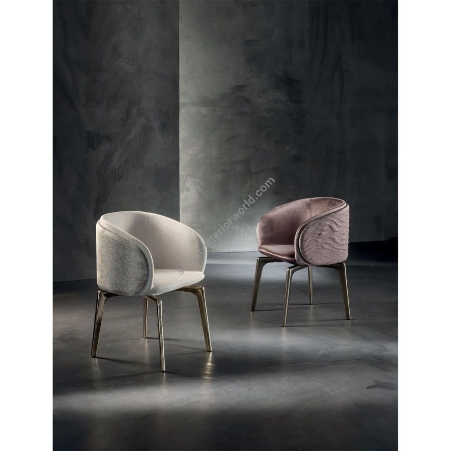 The chair’s frame is made from aluminium covered in polyurethane foam and injected into a mould. The external covers, on the structure’s either sides are made from curved plywood with a light layer of high density polyurethane foam and covered in plain or dual colour. These can be quilted with the “Groove”decoration. The legs come in two versions: either from solid ash wood available in black, liquorice, mink brown, wenge, ebony, walnut, or natural ash; or produced through a metal casting process using a special mould, and painted in the following finishes: Satined Champagne, Bright/satined Burnished, Shaded copper, Bright/satined shaded brown, Bright/ satined Black Rose gold, Bright/ satined light gold, Bright/satined chrome, Bright/ satined black chrome, Matt satined bronze. Leather and fabric upholstery is NOTr emovable.