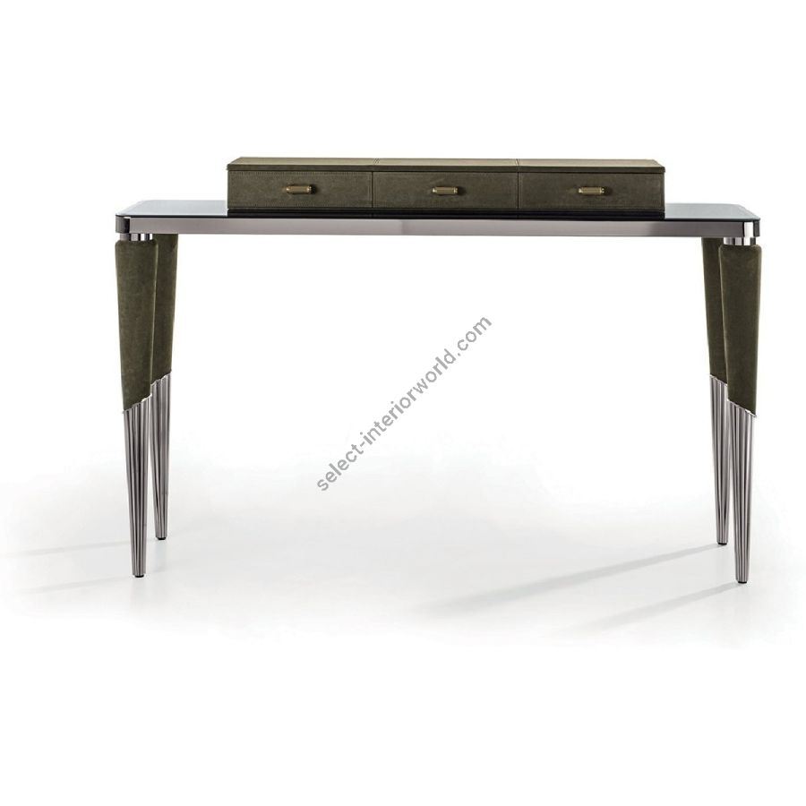 Console with 4 conical legs covered in cat. P.3 Miami/SoftLeather/Suede leather and a grooved metal ferrule in the finishes: Satin nickel, bright shaded brown, Black Rose gold, bright light gold, matt Champagne gold, bright chrome, bright black chrome, matt satin bronze, bright pink gold, matt pink gold. Underplate edge in metal in the same finishes as the leg ferrules. On the top, drawer unit with 3 drawers covered internally in leather. Handles in grooved metal in the same finish as the leg ferrules. Top finishes:5 mm bronze or smoky mirror with bevel 20mm marble with 20mm bevel: White Carrara marble, ImperialBrown marble, Sahara Noir marble (glossy and matt polyester finish), Dover White marble, Panda White marble, Guatemala Green marble, Corteccia marble, Port Saint Laurent marble, Red Levanto marble, Bardiglio Nuvolato marble, Elegant Brown marble, Shale Rosewood marble, Emperador Dark marble, SilverWave marble, Agatha Black marble, Frappuccino marble, Calacatta marble, Fusion Light marble, Patagonia marble, Explosion Blue marble, Fusion Multicolor marble, Juliet Quartz marble, Calcite Azul marble, Azul Macauba marble, Portoro marble.