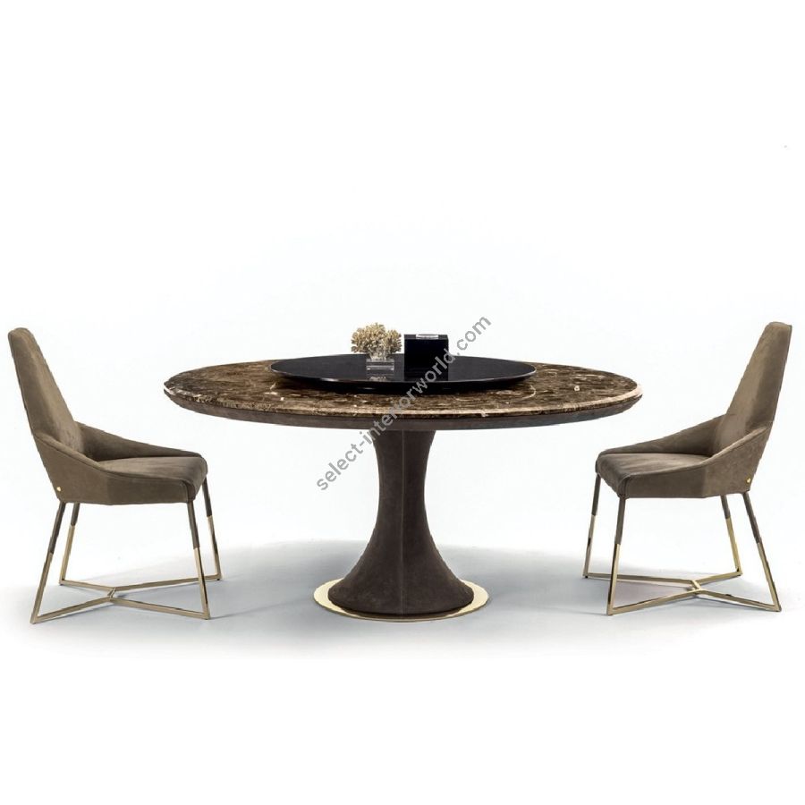 Round table made of a hyperboloid shaped base in glass fibre, with internal structure in painted metal, covered in range leathers with an underbase plate in metal in the finishes: Satin nickel, Bright shaded brown, Black Rose gold, bright light gold, matt Champagne gold, bright chrome, bright black chrome, matt satin bronze, bright pink gold, matt pink gold. Top finishes: painted black crystal 10 mm with bevelling, bronze or smoky mirror 5 mm with bevelling, 20 mm thick marble, with 20 mm bevel in: White Carrara marble, Imperial Brown marble, Sahara Noir marble (glossy and matt polyester finish), Dover White marble,Panda White marble, Guatemala Green marble, Corteccia marble, Port Saint Laurent marble, Red Levanto marble, Bardiglio Nuvolato marble, Elegant Brown marble, Shale Rosewood marble, Emperador Dark marble,Silver Wave marble, Agatha Black marble, Frappuccino marble, Calacatta marble, Fusion Light marble, Patagonia marble, Explosion Blue marble, Fusion Multicolor marble, Juliet Quartz marble. Undertop covered in leather from the range, coordinated with the base. A revolving top (cm Ø 75-90-110) is availableto set on the top, in the finishes: glossy lacquered wood in range colours, glossy/matt Maple, glossy/mattheat-treated Eucalyptus, glossy/matt Sycamore frisè, glossy/matt Ebony, glossy/matt Canaletto walnut,glossy Walnut burl wood or in marble in the varieties listed in the catalogue.