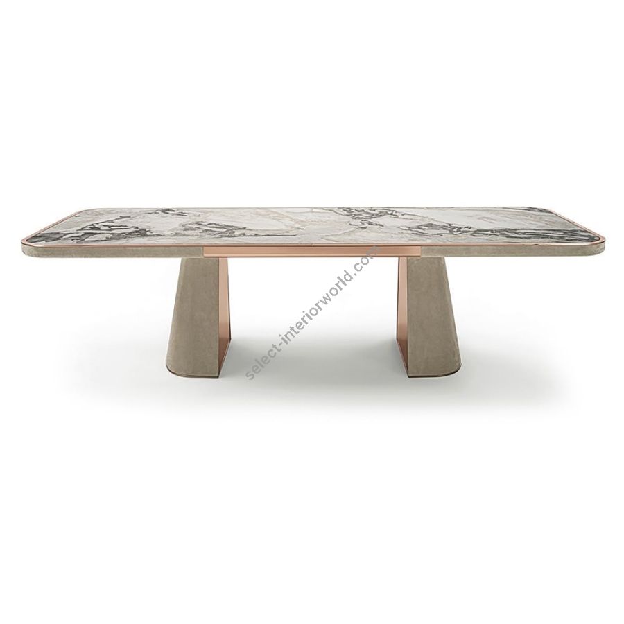 Table with 2 legs in glass fibre, covered externally in leather and internally in metal sheet in the following finishes: Satin nickel, Bright shaded brown, Black Rose gold, bright light gold, matt Champagne gold, bright chrome, bright black chrome, matt satin bronze, bright pink gold, matt pink gold. To complete the leg, thebase is enhanced with a metal foot in the same finish as the plate. The undertop is covered in leather fromthe catalogue, like the leg, and decorated with metal inserts coordinated with the metal sheet on the base. The top has a perimeter border in metal that encloses the top, in the finishes: White Carrara marble, ImperialBrown marble, Sahara Noir marble (glossy and matt polyester finish), Dover White marble, PandaWhite marble, Guatemala Green marble, Corteccia marble, Port Saint Laurent marble, Red Levanto marble, Bardiglio Nuvolato marble, Elegant Brown marble, Shale Rosewood marble, Emperador Dark marble, SilverWave marble, Agatha Black marble, Frappuccino marble, Calacatta marble, Fusion Light marble, Patagonia marble, Explosion Blue marble, Fusion Multicolor marble, Juliet Quartz marble. A lazy susan (cm Ø 75-90-110) is available to set on the top, in the finishes: glossy lacquered wood in range colours, glossy/matt Maple, glossy/matt heat-treated Eucalyptus, glossy/matt Sycamore frisè, glossy/matt Ebony, glossy/matt Canaletto walnut, glossy Walnut burl wood or in marble in the varieties listed in the catalogue.