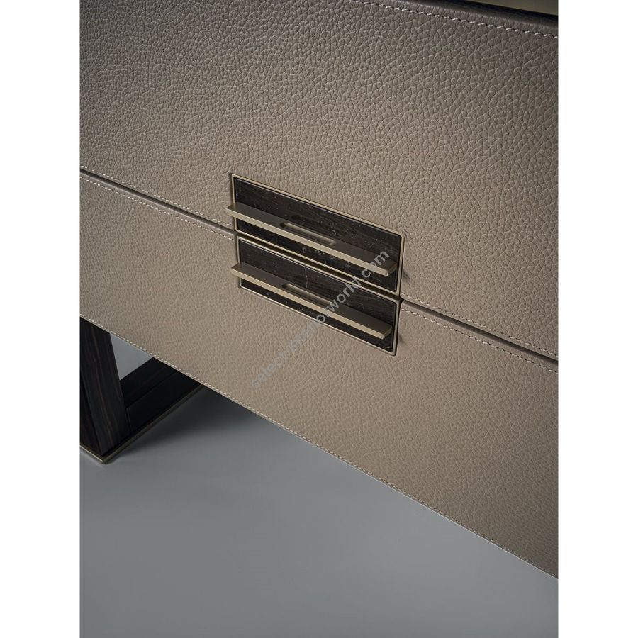 Chest of 4 drawers. Legs and frame covered in leather or cashmere Loro Piana Interiors from the range or wood: glossy lacquered wood in range colours, glossy/matt ebony, glossy/matt Canaletto walnut, glossy/matt Sycamore frisè. Profile of base and cornice in ground metal in the finishes: bright shaded brown, bright light gold, matt Champagne gold, bright chrome, bright black chrome, matt satin bronze, bright pink gold, matt pink gold, Black Rose gold. Top finish: bronze or smoky mirror with 20 mm bevel, black painted glass with 20 mm bevel, glossy lacquered wood in range colours, glossy/matt ebony, glossy/matt Canaletto walnut, glossy/matt Sycamore frisè. Marble mm 20 thick: Portoro marble, Fusion Light marble, Patagonia marble, Explosion Blu marble, Fusion Multicolor marble, Juliet quartz marble, Calcite Azul marble, Sahara Noir marble (polyester finish), Dover White marble, Panda White marble, Guatemala Green marble, Corteccia marble, Port Saint Laurent marble, Red Levanto marble, Bardiglio Nuvolato marble, Elegant Brown marble, Shale Rosewood marble, Emperador Dark marble, Silver Wave marble, Agatha Black marble, Frappuccino marble, Calacatta marble. Handle in marble from the range or like the top. On the back, two dimmable LED strips light the lower and upper part of the chest. They are turned on with a touch-sensitive switch. The effect is a strip of light that illuminates the wall.