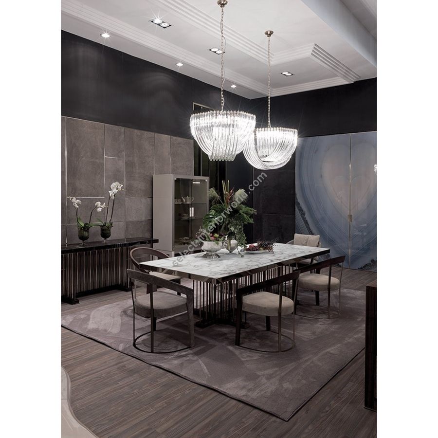 Lamp 8Xg9 (max 60W each), metal structure in the finishes polished chrome and bright light gold 24Kt. Murano glass rods. Luminaire in Murano crystal, with octogonal frame and overlapping pattern, space required: Ø80 cm. Metal frame in the finishes bright chrome and 24 Kt bright light gold. Electrification 8XE27 (max. 60 W each).