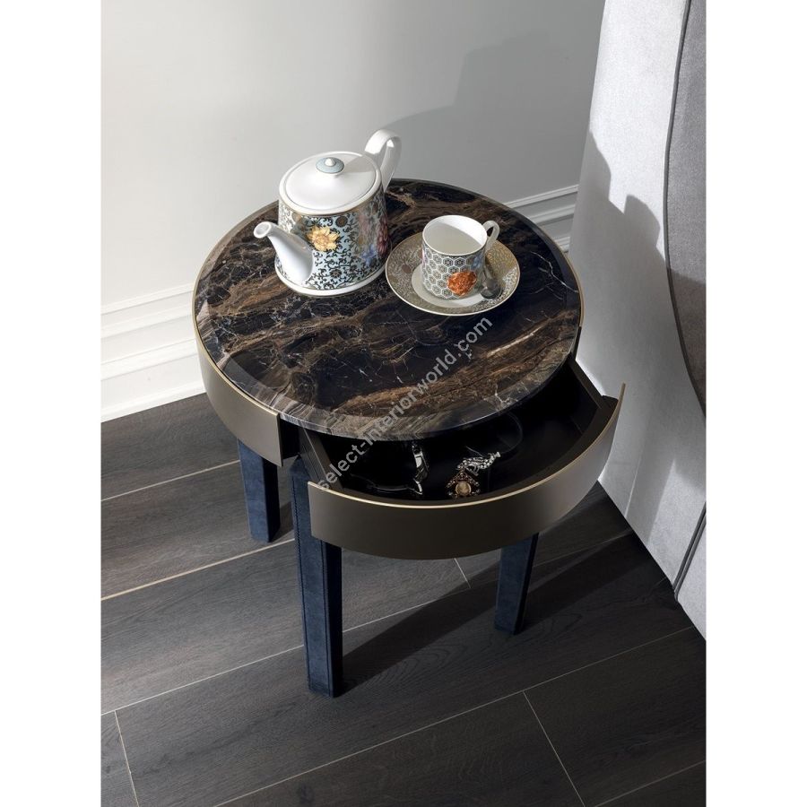 Night stand with small drawer, metal edge in the finishes: Satin nickel, Bright shaded brown, Black Rose gold, bright light gold, matt Champagne gold, bright chrome, bright black chrome, matt satin bronze,bright pink gold, matt pink gold. Legs covered in leather from the range or in wood: glossy lacquered wood in range colours, glossy/matt Maple, glossy/matt heat-treated Eucalyptus, glossy/matt Sycamore frisè, glossy/matt Ebony, glossy/matt Canaletto walnut. Top finish: bronze or smoky mirror glass painted black, legno a campionario, Marble mm 20 thick: White Carrara marble, Imperial Brown marble, Sahara Noir marble (glossy and matt polyester finish), Dover White marble, Panda White marble, Guatemala Green marble, Corteccia marble, Port Saint Laurent marble, Red Levanto marble, Bardiglio Nuvolato marble, ElegantBrown marble,- Shale Rosewood marble, Emperador Dark marble, Silver Wave marble, Agatha Black marble,Frappuccino marble, Calacatta marble, Fusion Light marble, Patagonia marble, Explosion Blue marble, Fusion Multicolor marble, Juliet Quartz marble, Calcite Azul marble.
