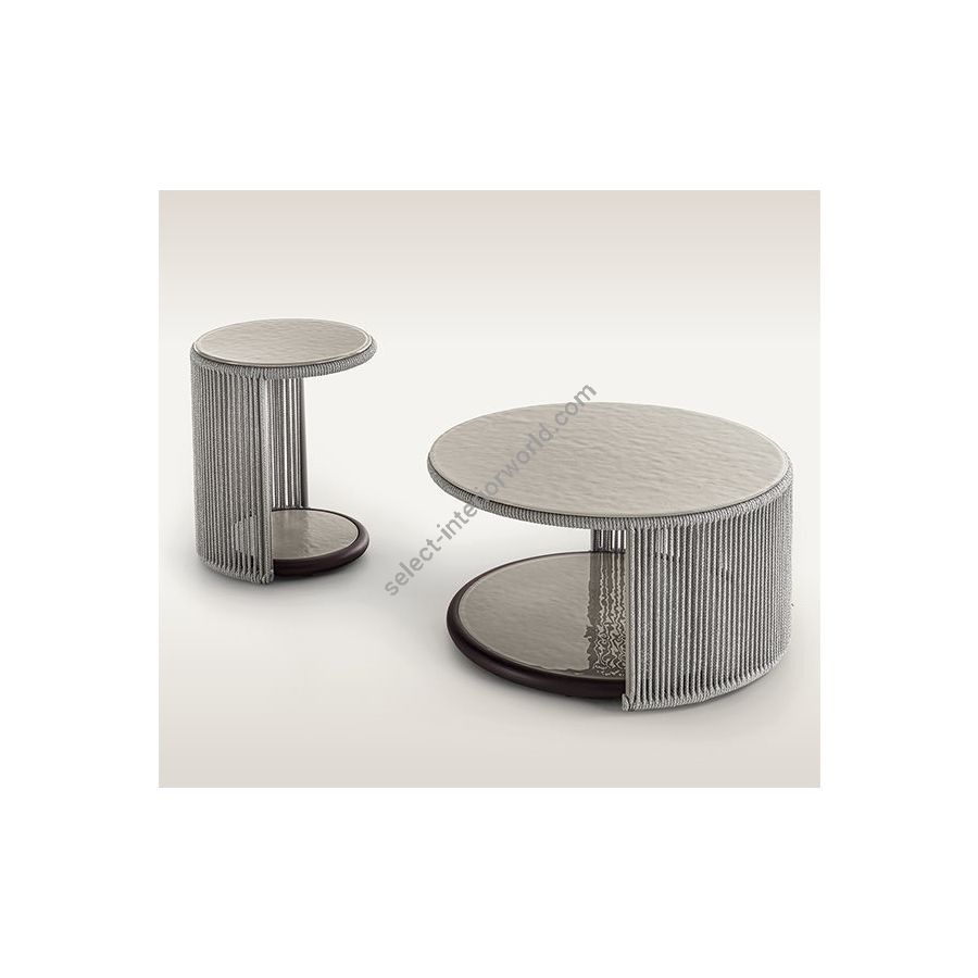 Small tables in epoxy-powder-coated 304 stainless steel, finely and manually woven with a fabricrope in the same colour. A ring in solid Iroko wood is fitted to the base, coloured with special water-based paints and fitted with a glass shelf coloured during fusion to match the table top.