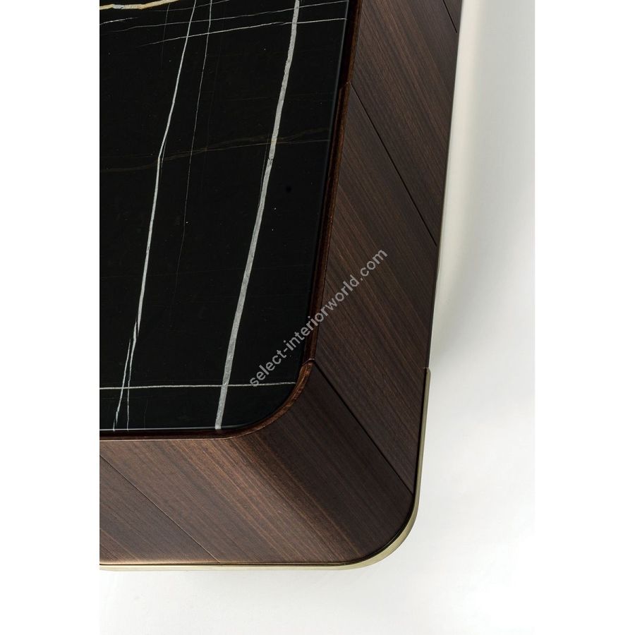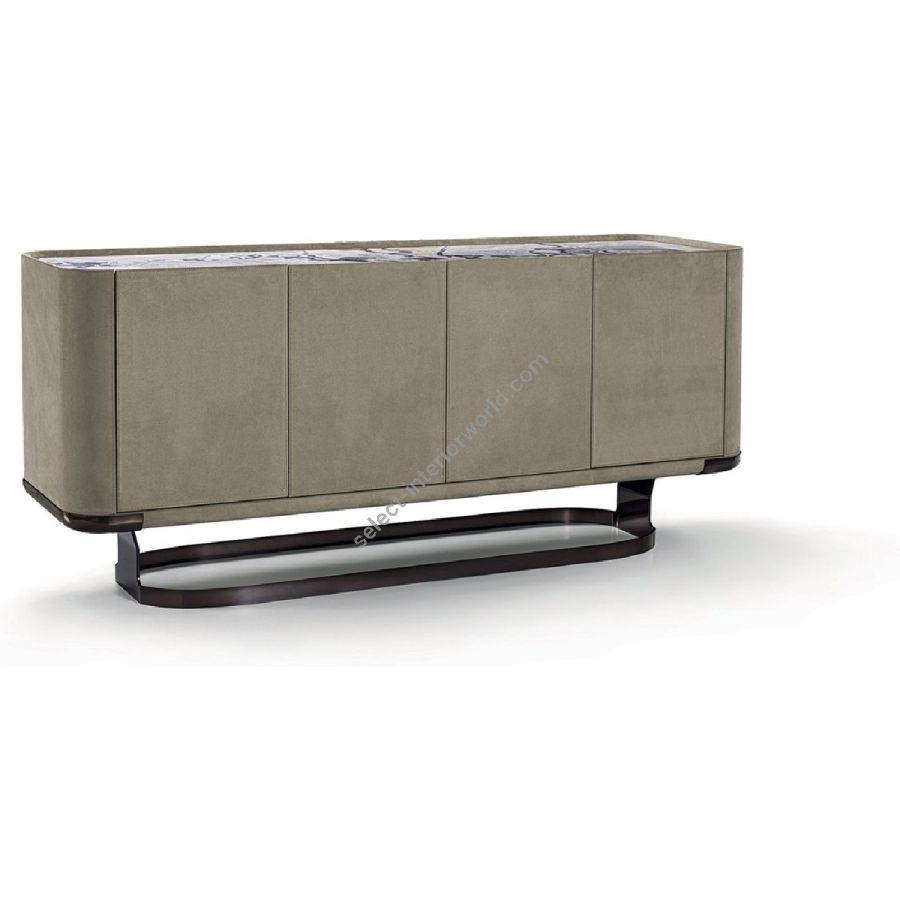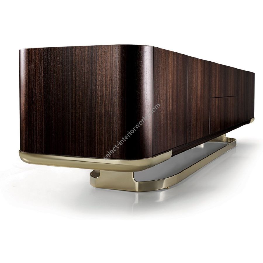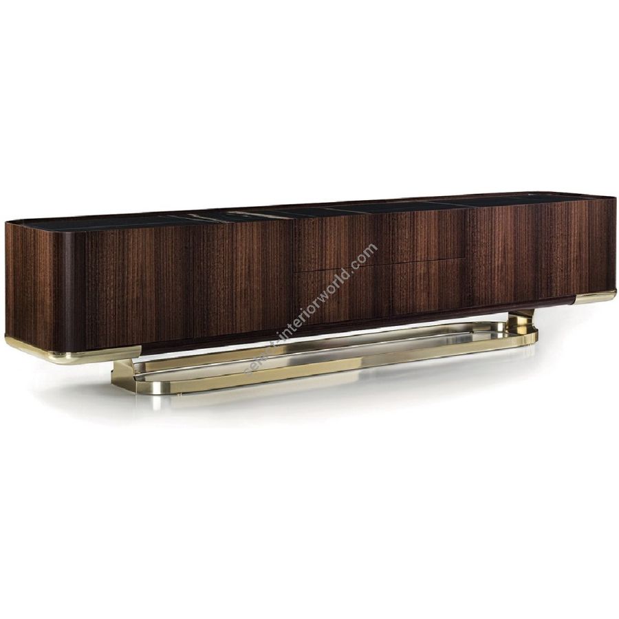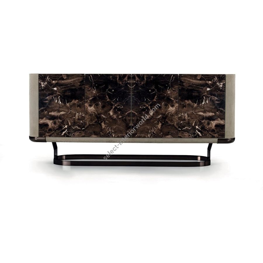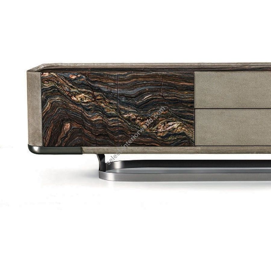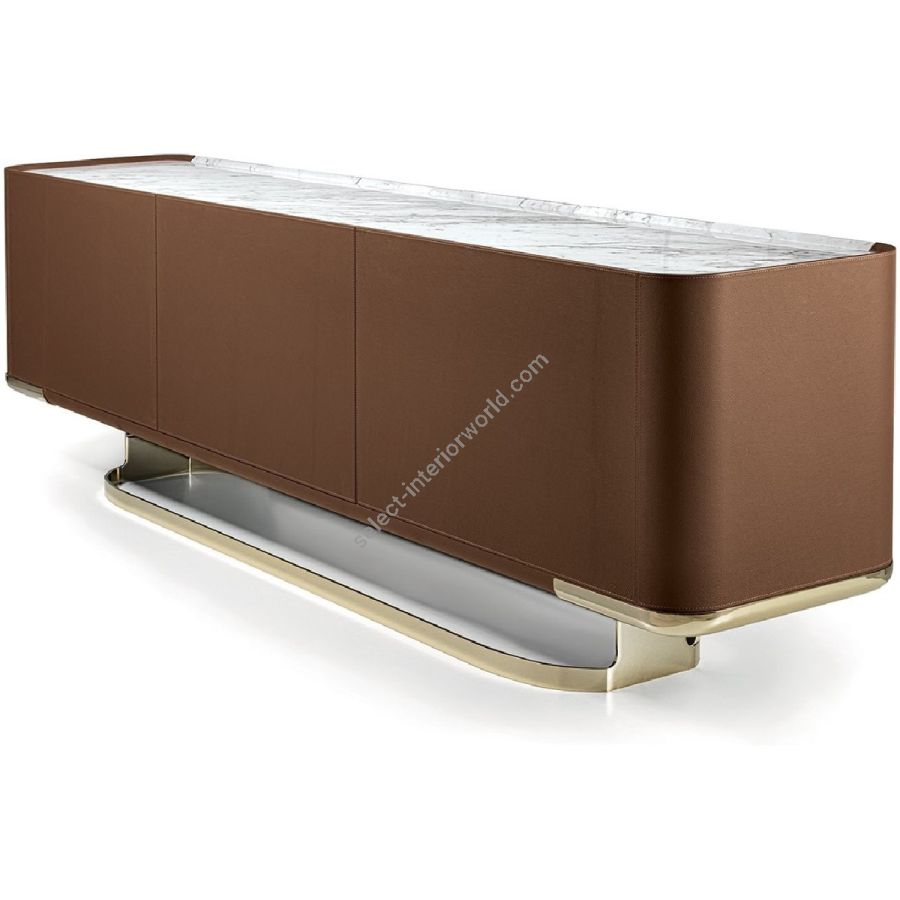 Collection of living room furniture available in two heights and two widths, and comprising a storagecontainer unit with drawers and doors. The versions available are listed below: A - Completely in wood, B - Completely covered in leather, C - Structure in wood with doors or drawers covered in leather, D - Structure covered in leather with doors or drawers in wood, E - Structure in wood with doors in marble, F - Structure covered in leather with doors in marble. The base that wraps around the container is in laser cut ground metal in the finishes: Satin nickel, Bright shaded brown, Black Rose gold, bright light gold, matt Champagne gold, bright chrome, bright black chrome, matt satined bronze, bright pink gold, matt pink gold. The container unit and its side boards are covered in leather from the catalogue or in wood: glossy/matt Maple, glossy/matt heat-treated Eucalyptus, glossy/matt Ebony, glossy/matt Sycamore frisè, Glossy lacquered wood in range colours. The top is recessed into the container structure and it creates a hollow where the doors are secured. The top comes in the finishes: bronze or smoky mirror, White Carrara marble, Imperial Brown marble, Sahara Noir marble (glossy and matt polyester finish), Dover White marble, Panda White marble, Guatemala Green marble, Corteccia marble, Port Saint Laurent marble, Red Levanto marble, Bardiglio Nuvolato marble, ElegantBrown marble, Shale Rosewood marble, Emperador Dark marble, Silver Wave marble, Agatha Black marble,Frappuccino marble, Calacatta marble, Fusion Light marble, Patagonia marble, Explosion Blue marble,Fusion Multicolor marble, Juliet Quartz marble; or in the wood finishes. Only the doors can be in shaped marble, and the selection is limited due to structural problems of the material. Matt lacquered interiors and glass shelves. Optional: internal flatware drawer. The piece is finished on all sides, but the version with the back unfinished is an option.