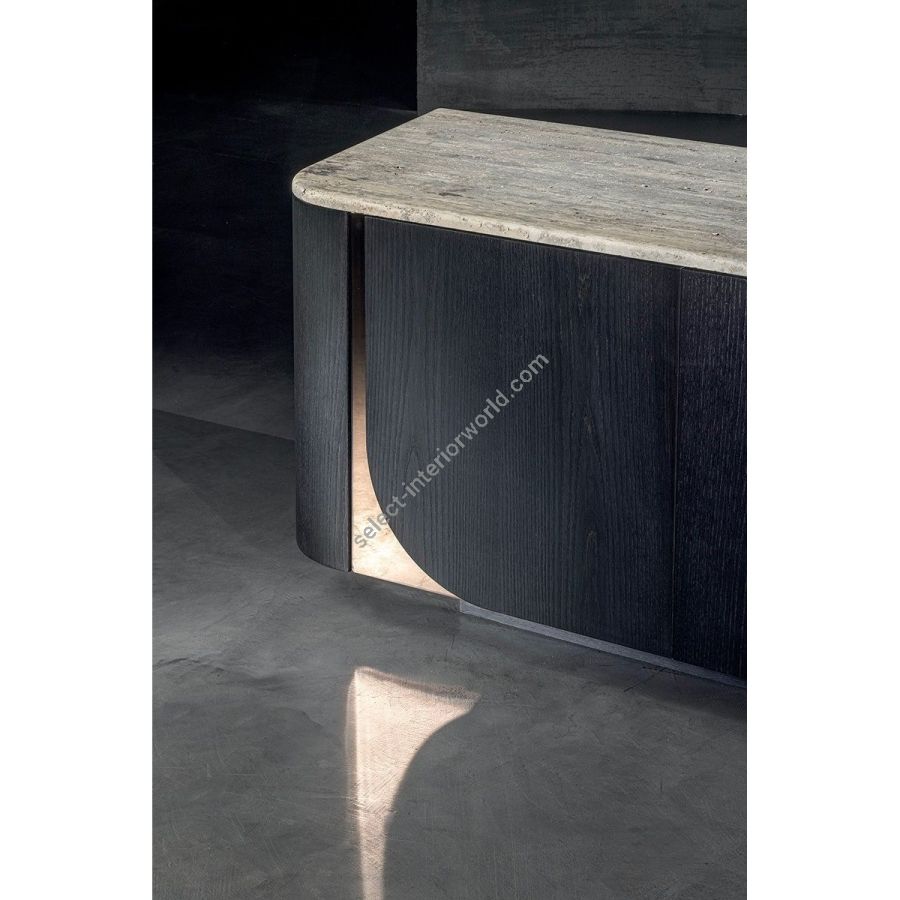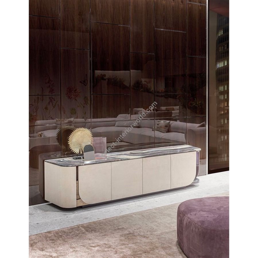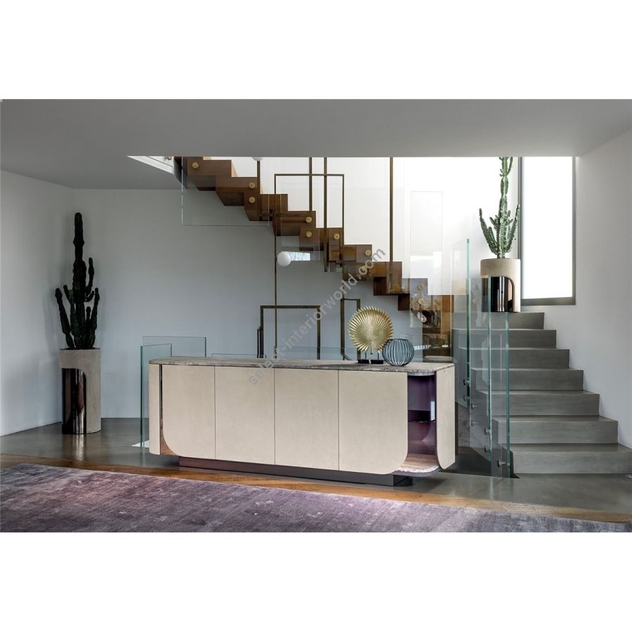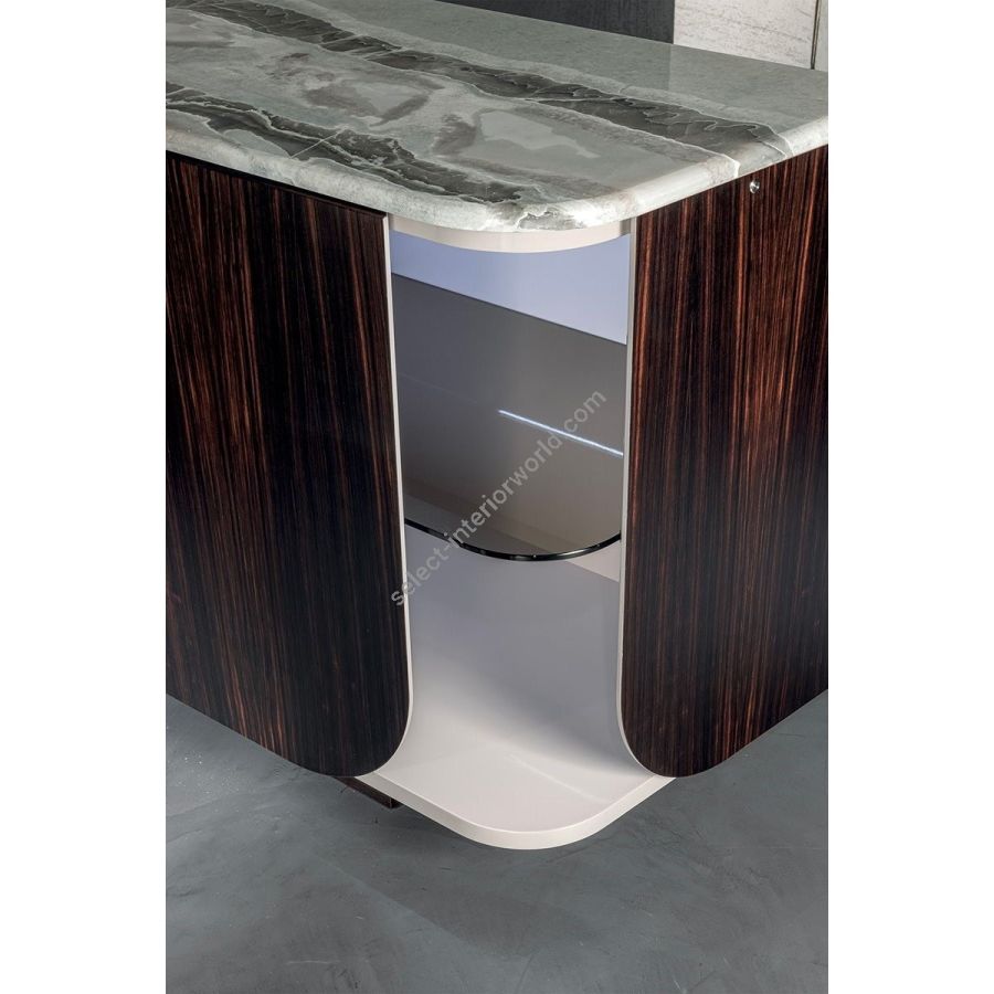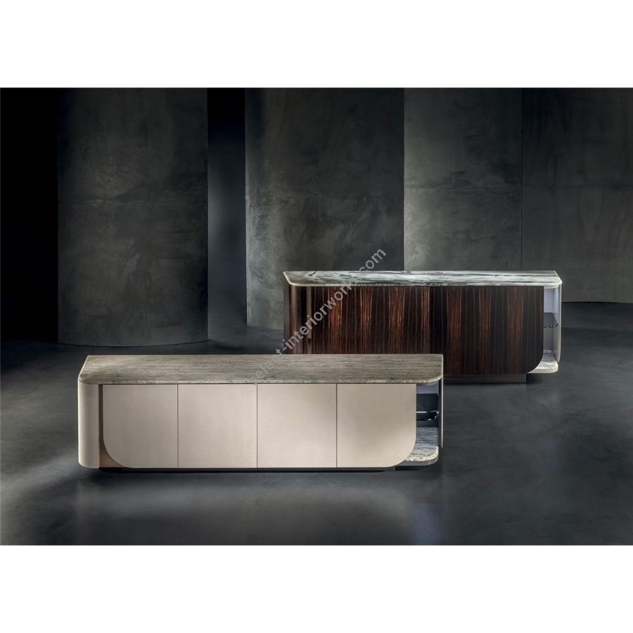 Collection of furniture with a trapezoidal shape, with curved corners, available in two heights. Wooden structure, upholstered externally in leather from the catalogue or in wood: Glossy/matt eucalyptus, Glossy/matt ebony, Glossy/matt medium Canaletto walnut, Glossy/matt sycamore frisè, Matt liquorice stained ash wood. The inside of the structure is finished in glossy lacquer in colours from the catalogue, including the two exclusive colours “Quartz” and “Lilac grey”, or in matt bronze lacquer. The 4 doors have bevelled edges. Internally, they have a lacquered finish, and their exterior is covered in leather from the catalogue or wood coordinated with the structure. The internal shelves are in bronzed glass. Only the high version has a central compartment with two internal drawers with leather fronts coordinated with the structure, and if the structure is in wood, the drawer fronts are covered in P.3 leather. This cabinet features: a semi-open compartment with LED lighting and a marble base, coordinated with the top, as an optional - and a metallic insert in the finishes in the catalogue. The trapezoidal marble top (20 mm thick) is in: Travertino, Silver Beola,Cipollino marble, Arabescato Orobico marble, Silver Stream marble, White Carrara marble, Imperial Brown marble, Elegant Brown marble, Sahara Noir marble (polyester finish), Dover White marble, GuatemalaGreen marble, Red Levanto marble, Shale Rosewood marble, Emperador Dark marble, Silver Wave marble,Agatha Black marble, Frappuccino marble, Calacatta marble, Patagonia marble, Juliet Quartz marble.
