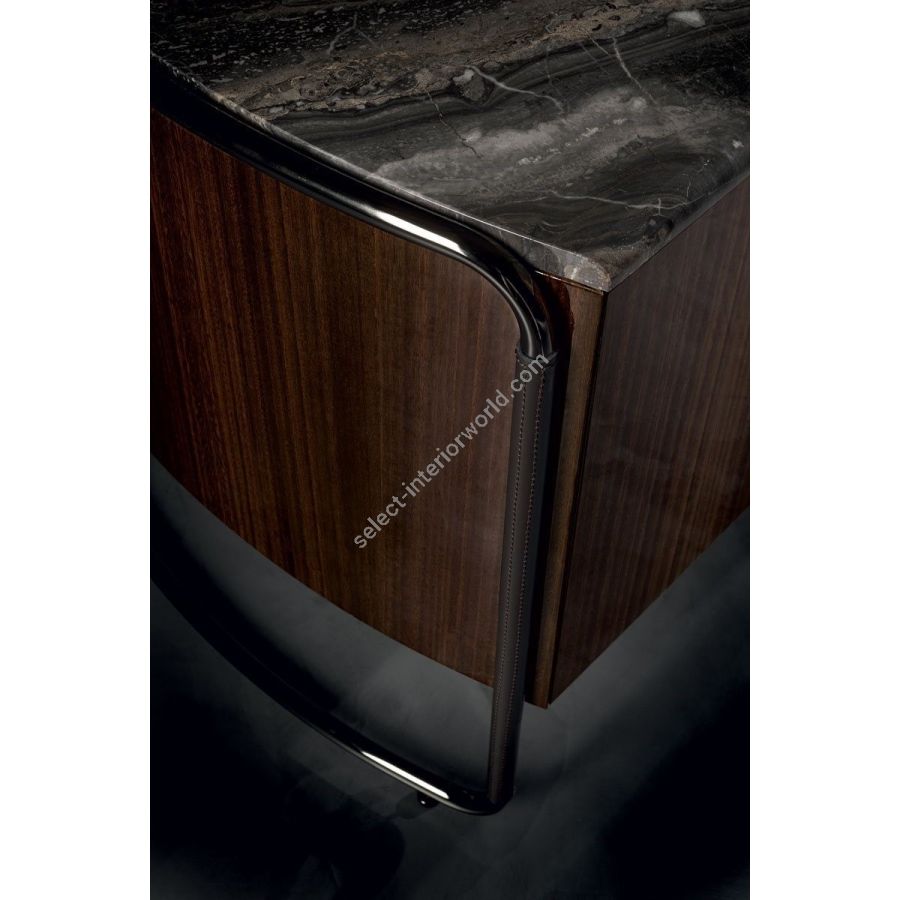Collection of living room furniture characterized with rounded tubular metal parts, available in two heights and two widths, and comprising a storage container unit with drawers and doors. The wood structure is in glossy/matt Maple, glossy/matt heat-treated Eucalyptus, glossy/matt Ebony, glossy/matt medium Canaletto walnut, glossy/matt Sycamore frisè, or covered in leather from the categories P.3 Tecsuede/P.6 Soffio. The external sides are in tubular metal, slightly curved like a hug, in the finishes: Shaded copper, Bright shaded brown, Black Rose gold, bright light gold, Champagne gold, bright chrome, bright black chrome, matt satined bronze. The tubular metal parts, handles, and supporting base are partially covered in “Renova”, a particular type of recycled leather that is sustainable and anti-bacterial. Available in the colours shown in the catalogue. The top is available in wood 22 mm: glossy/matt Maple, Glossy/matt heat-treated Eucalyptus, glossy/matt Ebony, Glossy/matt medium Canaletto walnut, glossy/matt Sycamore frisè. Or in marble, thickness 20 mm: Silver beola stone, Cipollino marble, Arabescato Orobico marble, Silver Stream marble, White Carrara marble, Imperial Brown marble, Sahara Noir marble (polyester finish), Dover White marble, Guatemala Green marble, Red Levanto marble, Shale Rosewood marble, Emperador Dark marble, Silver Wave marble, Agatha Black marble, Frappuccino marble, Calacatta marble, Patagonia marble, Juliet Quartz marble. A crystal shelf is positioned inside. The cabinet is finished on all sides.
