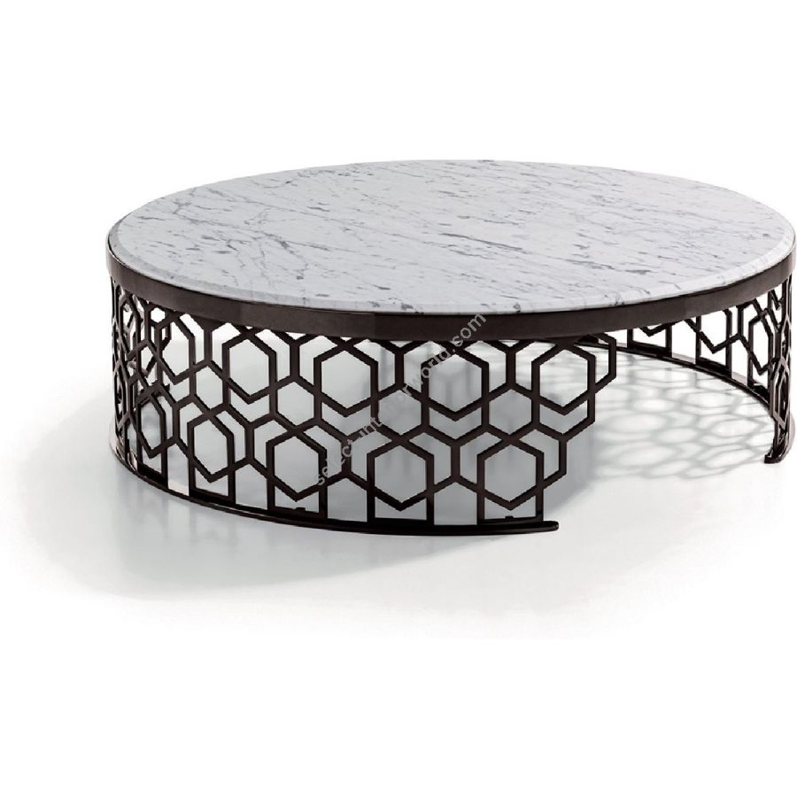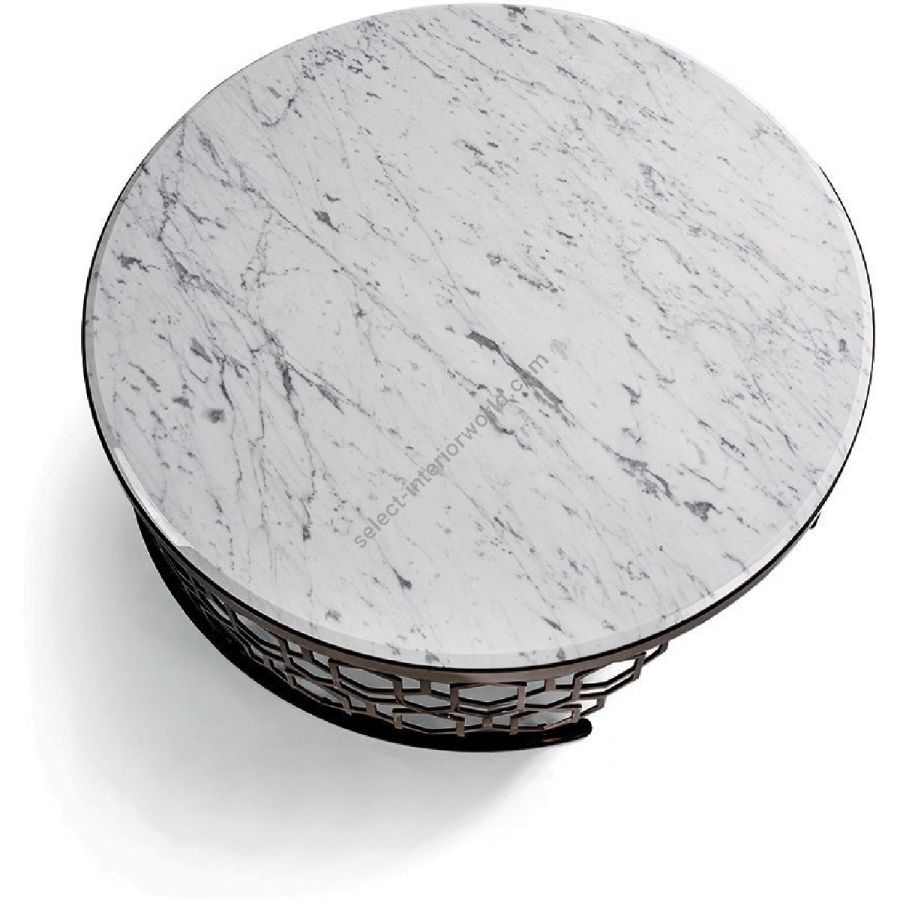 Small table with base formed from ground laser-cut metal with a curved “Sequence” decoration. Structure finish: Satin nickel, bright shaded brown, Black Rose gold, bright light gold, matt Champagne gold, bright chrome, bright black chrome, matt satin bronze, bright pink gold, matt pink gold. Top finish: White Carrara marble, Imperial Brown marble, Sahara Noir marble (glossy and matt polyester finish), Dover White marble, Panda White marble, Guatemala Green marble, Corteccia marble, Port Saint Laurent marble, Red Levanto marble, Bardiglio Nuvolato marble, Elegant Brown marble, Shale Rosewood marble, Emperador Dark marble, Silver Wave marble, Agatha Black marble, Frappuccino marble, Calacatta marble, Fusion Light marble, Patagonia marble, Explosion Blue marble, Fusion Multicolor marble, Juliet Quartz marble, Calcite Azul marble, Azul Macauba marble, Portoro marble.
