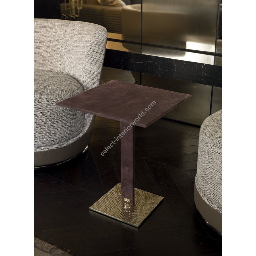 Square small service tables, functional because they are easy to move when needed, and precious because of the materials used to make them. They are an accessory that enhances the linear look of the sofa. The cast brass base is hand engraved, the tops and column are in marble or covered in Nabuck leather or suede.