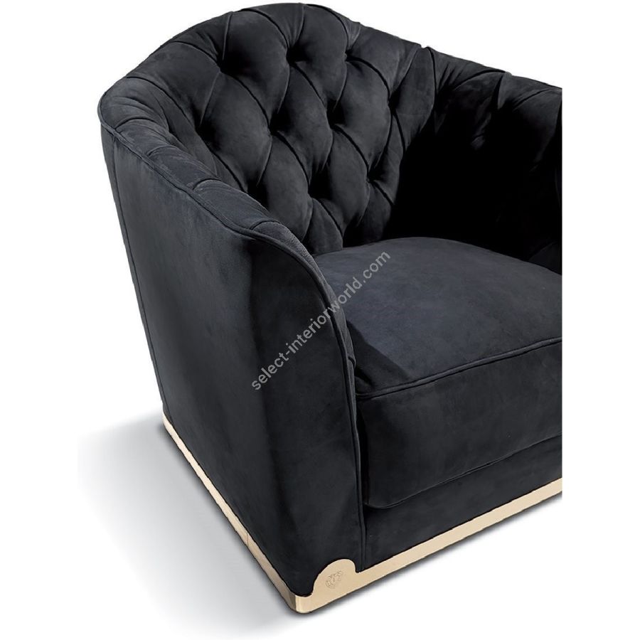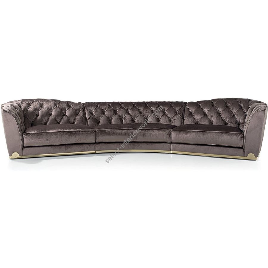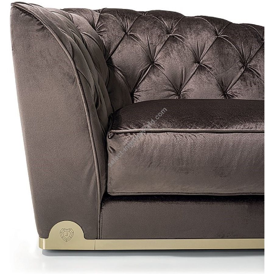 Frame in wood with elastic bands, covered in multi-thickness polyurethane foam. Seat cushion in sterilised goose down with insert in multi-thickness polyurethane foam and reinforcements in “Visco Soft”, a particular soft, durable padding. The internal backrest is finished in a “Capitonné” pattern, with buttons in the same colour as the upholstery or with “Swarovski” crystals. The sofa edging can be in finely finished braided leather. Fabric and leather frame covers are not removable because of the particular manufacturing process. At the base of the sofa, there is a metal border with laser logo in the finishes: Satin nickel, bright shaded brown, bright light gold, matt Champagne gold, bright chrome, bright black chrome, matt satin bronze, bright pink gold, matt pink gold, Black Rose gold. Sofa with reduced depth (90 cm).