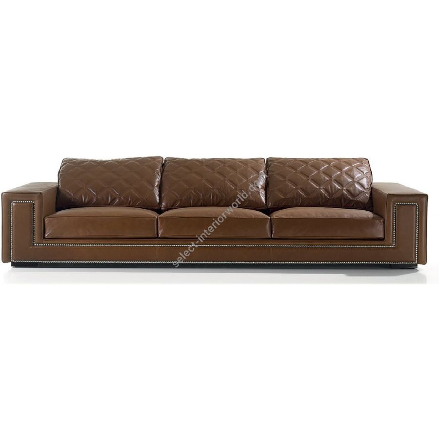 Frame in wood with elastic bands, covered in high density polyurethane foam. Seat cushions in sterilised goose down, with insert in medium density polyurethane foam. Backrest cushions in sterilised goose down. The backrest can be quilted with a diamond-shaped pattern (the backrest is available with or without quilting). The studs on the frame are in metal in the finishes black, polished chrome, gold or antiqued gold, or covered in leather. The element is available with low armrest in the variants marble, backlit onyx and wood with metal structure. The feet are in wood with a painted wengè finish. Given the special manufacturing process, fabric or leather upholstery is not removable. Sofa with reduced depth (100 cm).