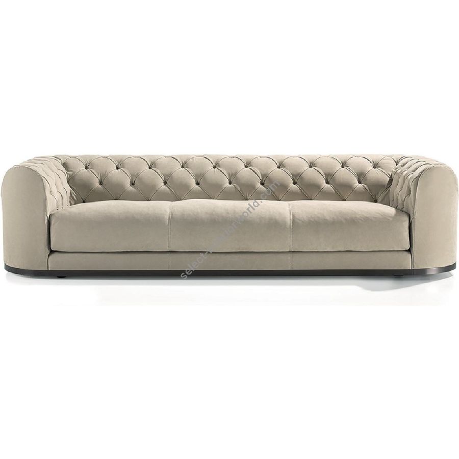 Frame in wood with elastic bands, covered in high density polyurethane foam. The backrest and part of the armrest is finished with tufted “Capitonné” handcrafted upholstery with plain coloured buttons or Swarovski crystal buttons. The seat cushion is covered in smooth triple density polyurethane foam, with a soft quilted cover in sterilised goose down. At the base of the sofa, there is a metal border in the finishes: Satin nickel, bright shaded brown, bright light gold, matt Champagne gold, bright chrome, bright black chrome, matt satin bronze, bright pink gold, matt pink gold, Black Rose gold. Given the particular process, the leather or fabric cover of the frame is not removable, but the seat cushion cover can be removed.