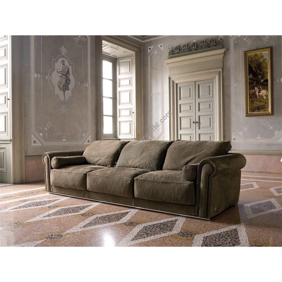 Wooden frame with elastic webbing covered with highdensity polyurethane foam in different thicknesses. Seat cushions of sterilized goose down and insert in polyurethane foam in different thicknesses reinforced with “Visco Soft”, a particular padding which provides better comfort and longer lasting life. Backrest cushions of sterilized goose down with insert in low-density polyurethane foam for greater comfort. Front aluminum base in polished aluminium or painted bronze. Back feet covered in the same material as the upholstery. Given the special processing of the arm, both the leather and fabric upholsteries are not removable on the structure, while cushions covers are removable. Sofa with reduced depth (105 cm).
