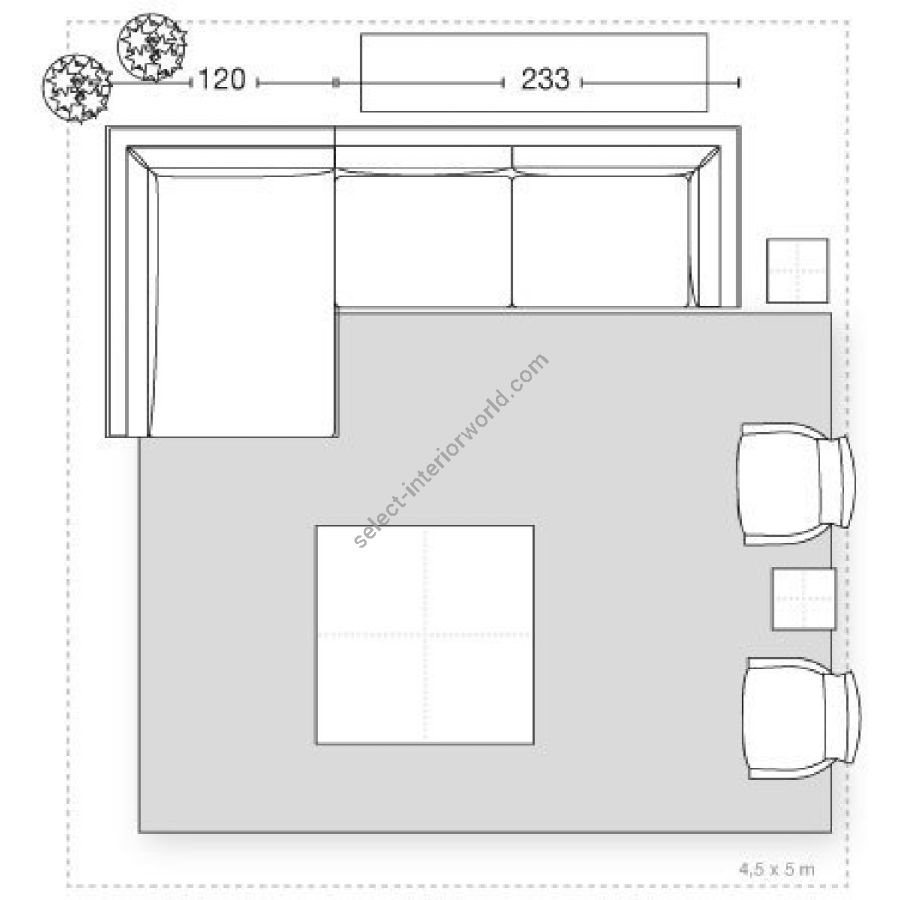 Frame in wood with elastic bands, covered in high density polyurethane foam. Backrest and armrest cushions are in sterilised goose down, with insert in medium-density polyurethane foam, and seat cushions are in triple-density polyurethane foam covered in sterilised goose down and supported with Memory Foam padding in order to maintain shape more effectively. Sofa available in two versions: fully padded without base or with chromed metal ring in the following finishes: Satin nickel, bright shaded brown, Black Rose gold, bright light gold, matt Champagne gold, bright chrome, bright black chrome, matt satin bronze, bright pink gold, matt pink gold. The open corner element, which can be used in compositions or as a chaise longue end unit - end unit with padded utility shelf, or utility shelf in marble or backlit dimmable onyx. Given the special manufacturing process, the structure upholstery is not removable, but the leather or fabric covers of all cushions are removable. The sofa comes in two depths: 105 and 95 cm.