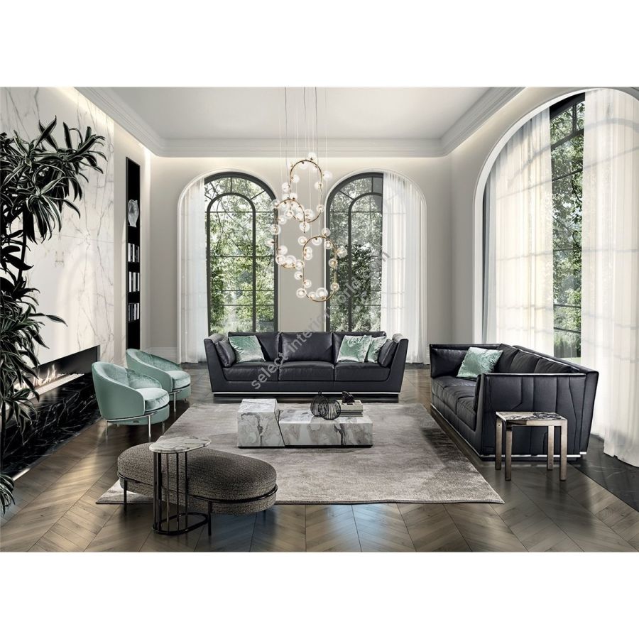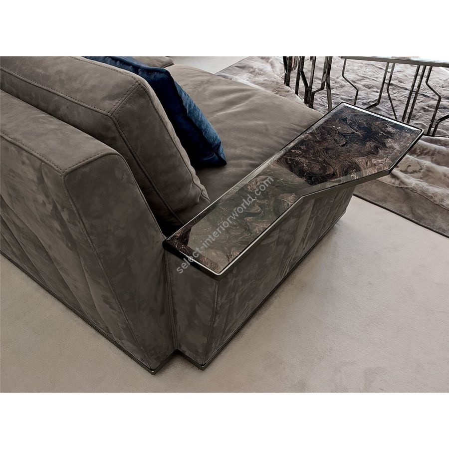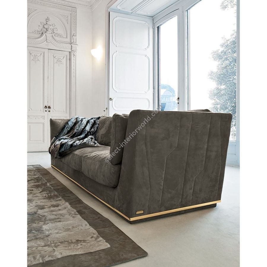 The series offers a choice of four types of armrests, interchangeable on both sides of the sofas. - High padded armrest with side cushion. - Low padded armrest without side cushion. - Low armrest with metal shelf. - Low armrest with metal frame (coordinated with the ring on the base) and shelf in marble from the catalogue or mirror (version A or B). Some special elements feature the same service shelves (in marble or metal) mounted on the lowered backrest. The metal ring on the base is available in the finishes: Satin nickel, bright shaded brown, bright light gold, matt Champagne gold, bright chrome, bright black chrome, matt satin bronze, bright pink gold, matt pink gold, Black Rose gold. The external upholstery in leather or fabric has a characteristic iconographic quilted pattern.The frame is in wood, with elastic bands, covered in high density, multi-thickness polyurethane foam. Seat cushions are in sterilised goose down with insert in multi-thickness polyurethane foam with memory foam reinforcement. Backrest cushions in sterilised goose down, with insert in soft polyurethane foam. Given the particular assembly of the product, the frame upholstery in fabric or leather is NOT removable, but both fabric and leather versions of seat and backrest cushion covers ARE removable. Sofa also available with reduced depth (95 cm).