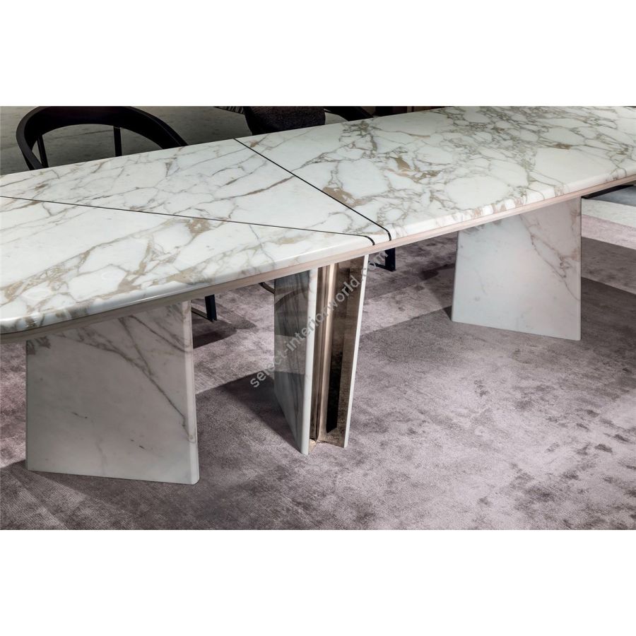 Table with 3 trapezoidal triangular legs covered in marble, coordinated with the top, and with rounded edges: Travertino, Silver Beola, Cipollino marble, Arabescato Orobico marble, Silver Stream marble, WhiteCarrara marble, Imperial Brown marble, Elegant Brown marble, Sahara Noir marble (polyester finish),Dover White marble, Guatemala Green marble, Red Levanto marble, Shale Rosewood marble, Emperador Dark marble, Silver Wave marble, Agatha Black marble, Frappuccino marble, Calacatta marble, Patagonia marble, Juliet Quartz marble. The leg interior has a curved metal insert in the following finishes: satinedChampagne, Bright/satined Burnished, Shaded copper, Bright/satined brown, Bright/satined Black Rose,Bright/satined light gold, Bright/satined chrome, Bright/satined black chrome, Matt satined bronze. The under top part is in leather with a metal border in the same leather as the insert. The marble top (20 mm thickness) is always coordinated with the leg finish. In the maxi version (330x130 - 300x110 cm), the top comes in 3 parts. Between the parts are 2 linear inserts in metal coordinated with the legs.