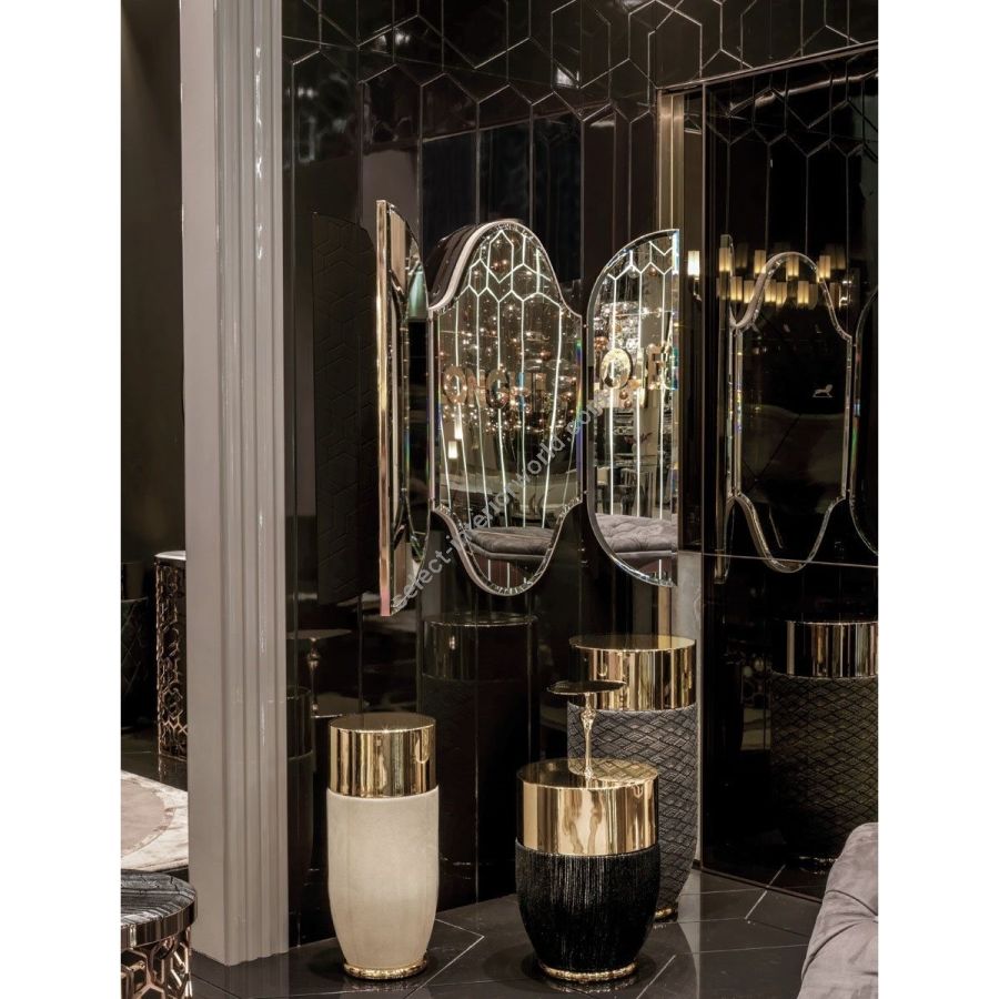 Mirror with doors covered in leather P.3 cat. Suede with smooth or 3D-effect relief with “Diamond” or “Sequence” decoration. Natural bevelled mirror mm 4.Load-bearing structure in ground metal in the finishes: Satined Champagne, Bright/satined, Burnished, Shaded copper, Bright/satined brown, Bright/satined, Black Rose gold, Bright/satined light gold, Bright/satined chrome, Bright/satined black chrome, Matt satined bronze.