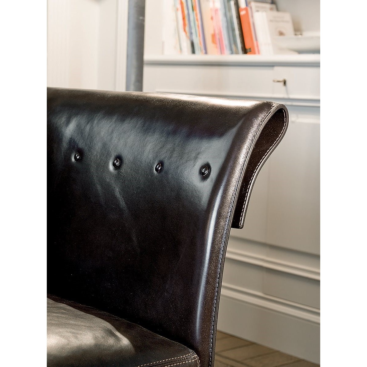 Iron armrest frame with moulded polyurethane foam. Wood backrest frame covered in double density polyurethane foam. Wood seat with elastic bands covered in triple density polyurethane foam with upper layer of Memory Foam to guarantee comfort and resistance to crushing. The entire sofa is covered with a soft quilted cover of sterilised goose down. Given the particular upholstery process, the backrest and armrest structures are only available with leather upholstery finished with plain coloured buttons or Swarovski crystal buttons. The seat and backrest cushions can be either in leather or fabric. Base in painted, oven cured metal in bronze or black. Given the particular process, the frame and seat covers - both in leather and fabric - are not removable, but backrest cushion covers are.
