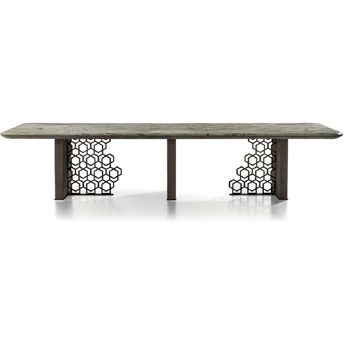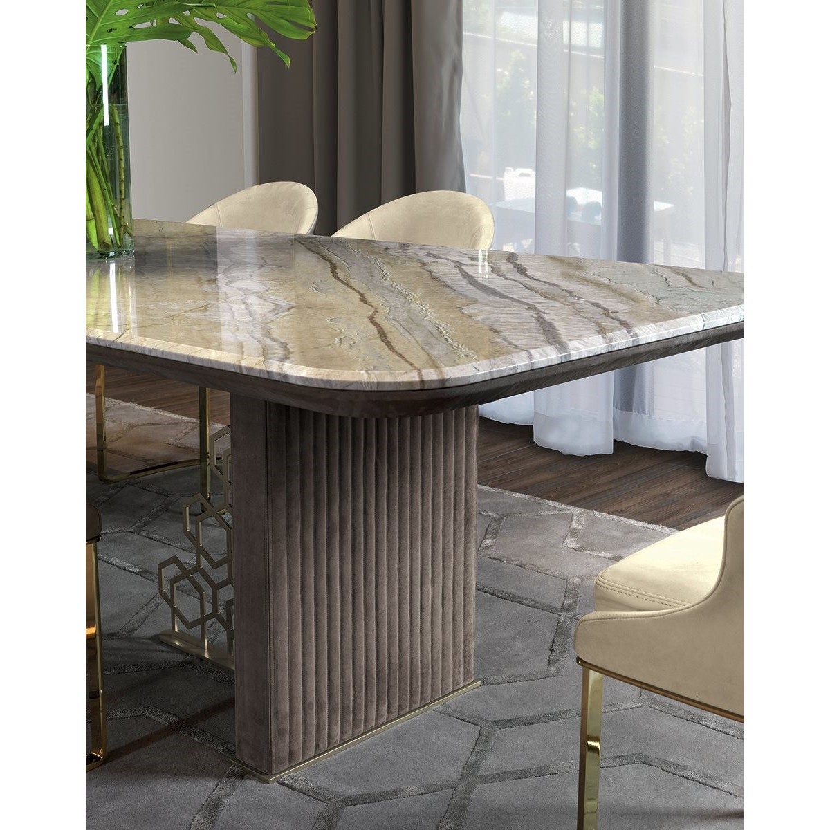 Table with base comprising an external side in wood, covered with quilted suede, and an internal section in ground metal with the “Sequence” decoration: a perforated pattern that looks like the result of a manual process but is actually the result of a sophisticated laser cutting process. The “beehive” decoration, by Giuseppe Iasparra, is a style, an authentic iconographic pattern that appears on several pieces in the Loveluxe collection - including tables, furniture and boiserie panels. It is an authentic expression of the Longhi personality. With its rounded corners, the Exelsior table has a unique shape, sophisticated in the choice of materials and balanced in proportions and thicknesses.