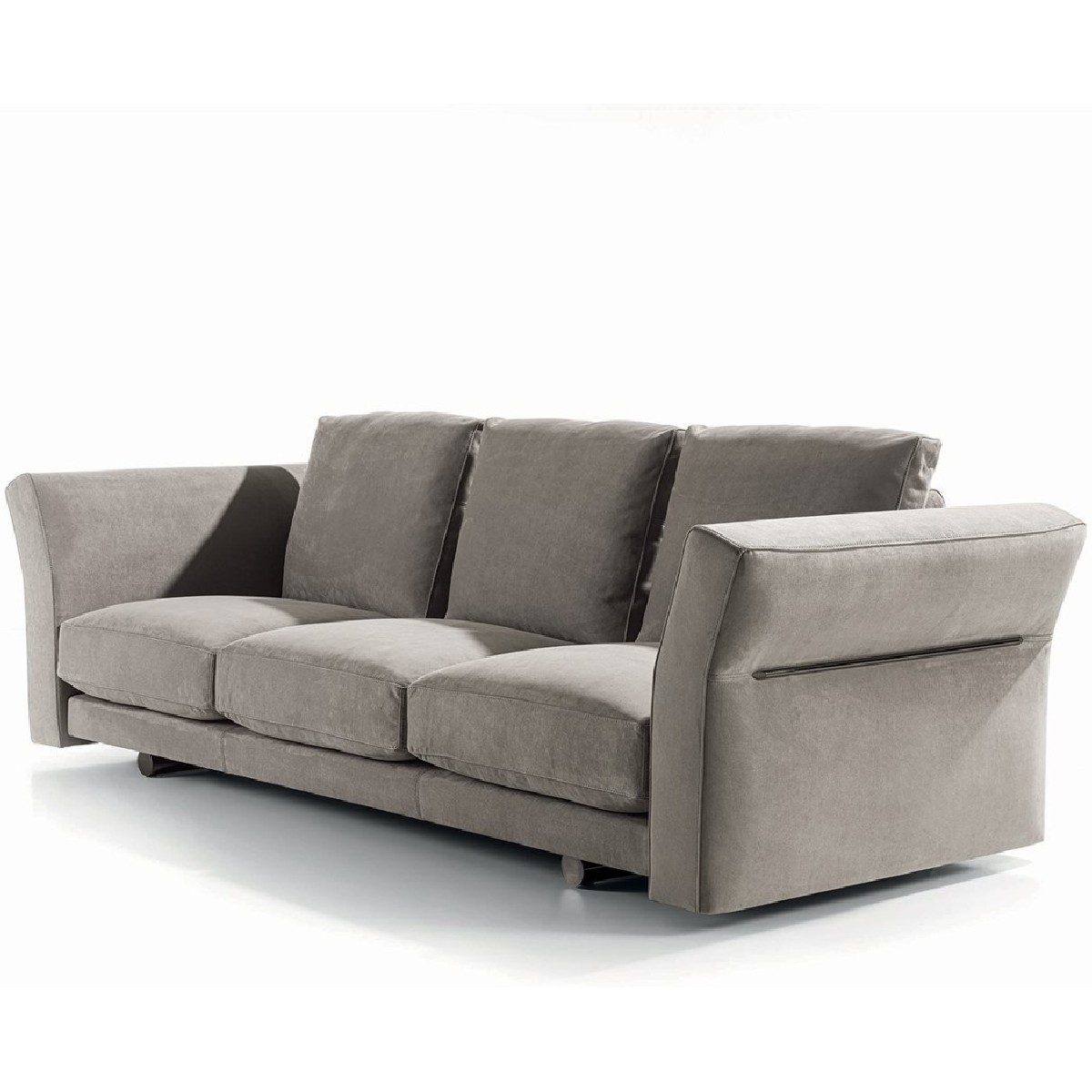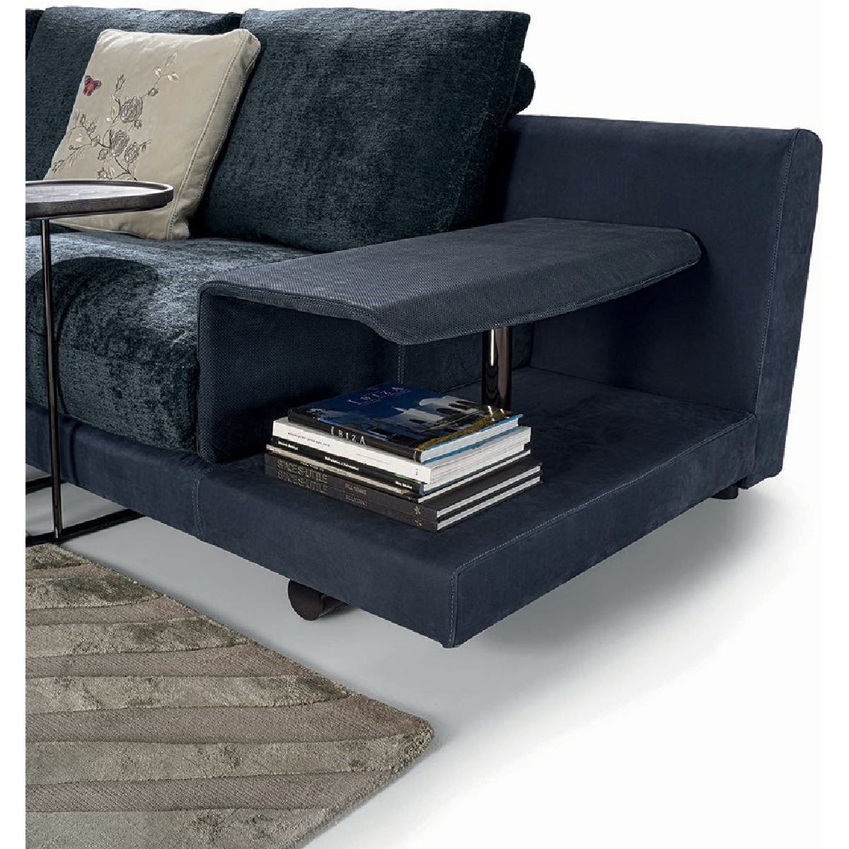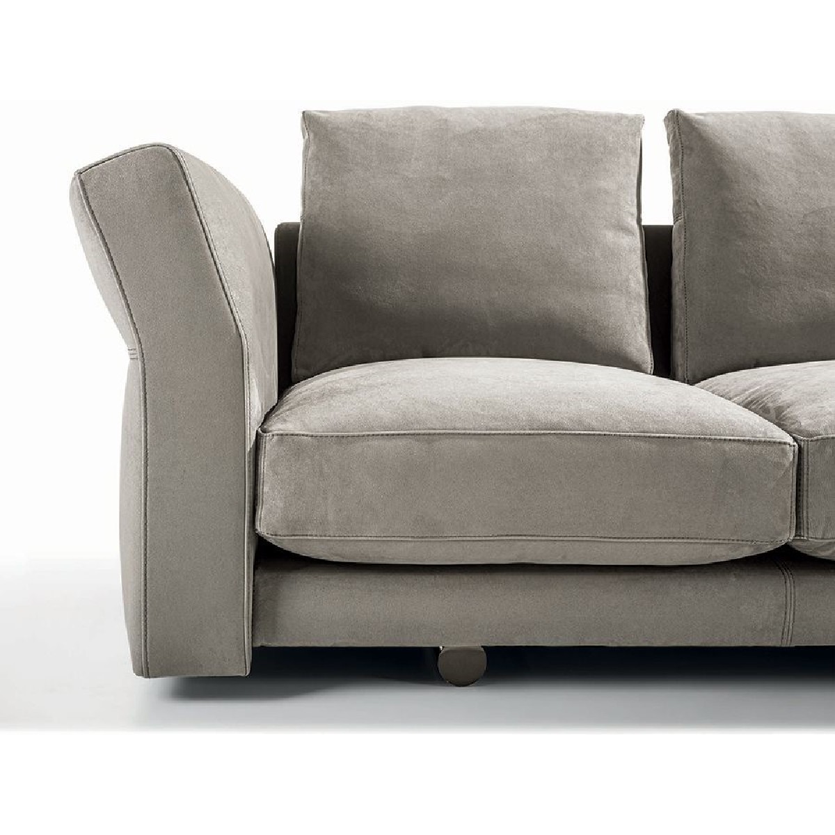 Riverside sofa, designed by Giuseppe Iasparra, features low and not excessively deep proportions and a deconstructed shape for a more relaxed, informal look, thanks to the use of large feathers cushions. Special accessories and small tables enrich the sofa with unexpected features. Riverside fits to perfection in a wide variety of contexts due to the elegance and simplicity of its lines. A metal insert embracing the armrest grants the piece a sense of sober elegance. With its high potential for aggregation, versatility and innovative design, the sofa introduces original and unexpected structural details, resulting in a dynamic and contemporary allure. The Riverside version with extended back makes it possible to insert small tables, for a variety of compositions.