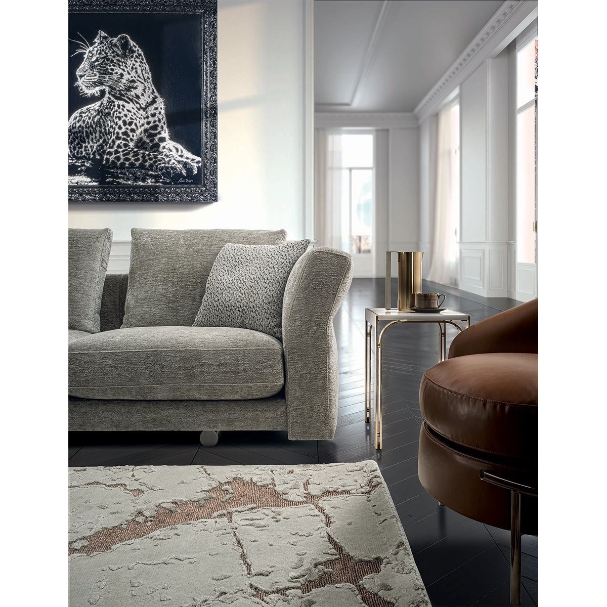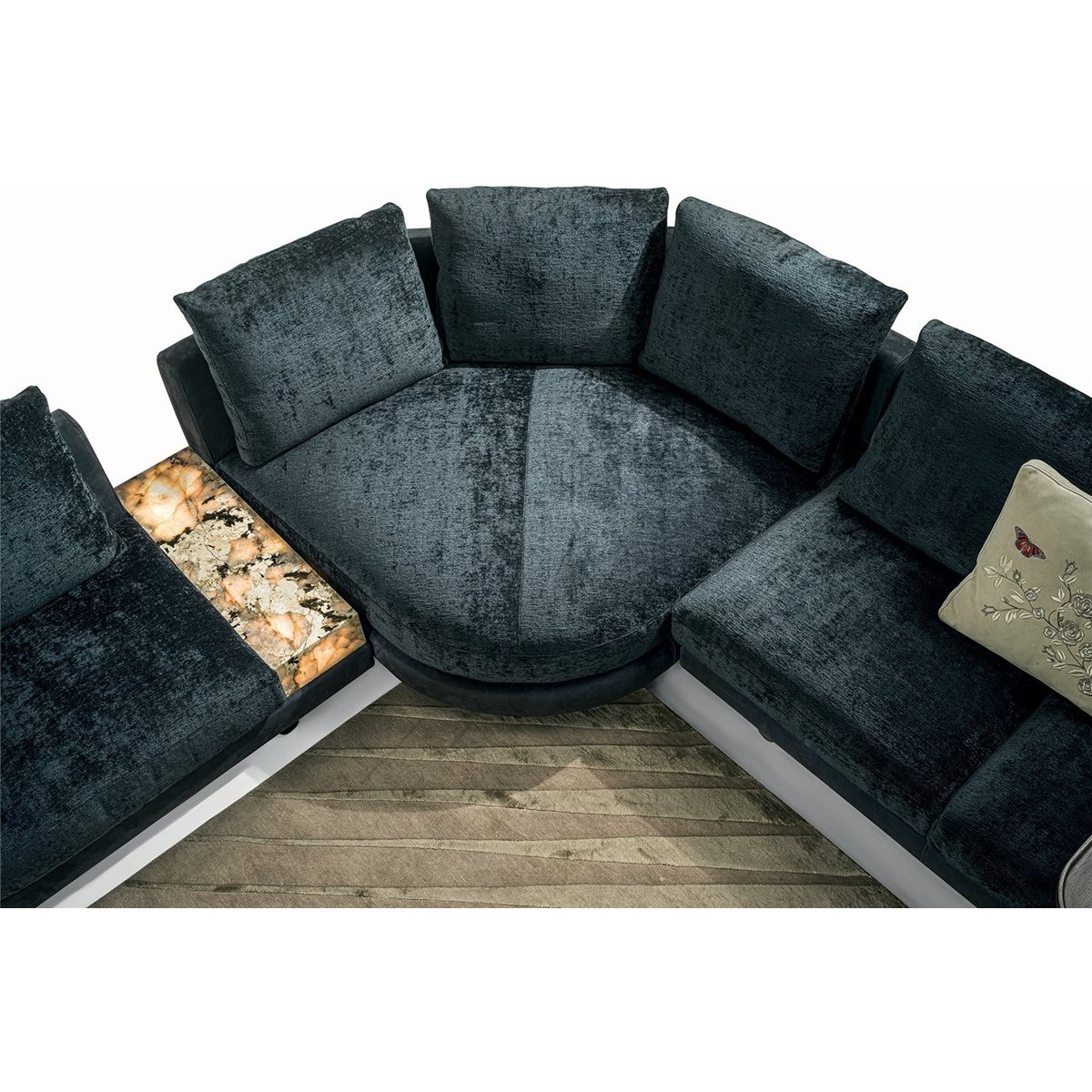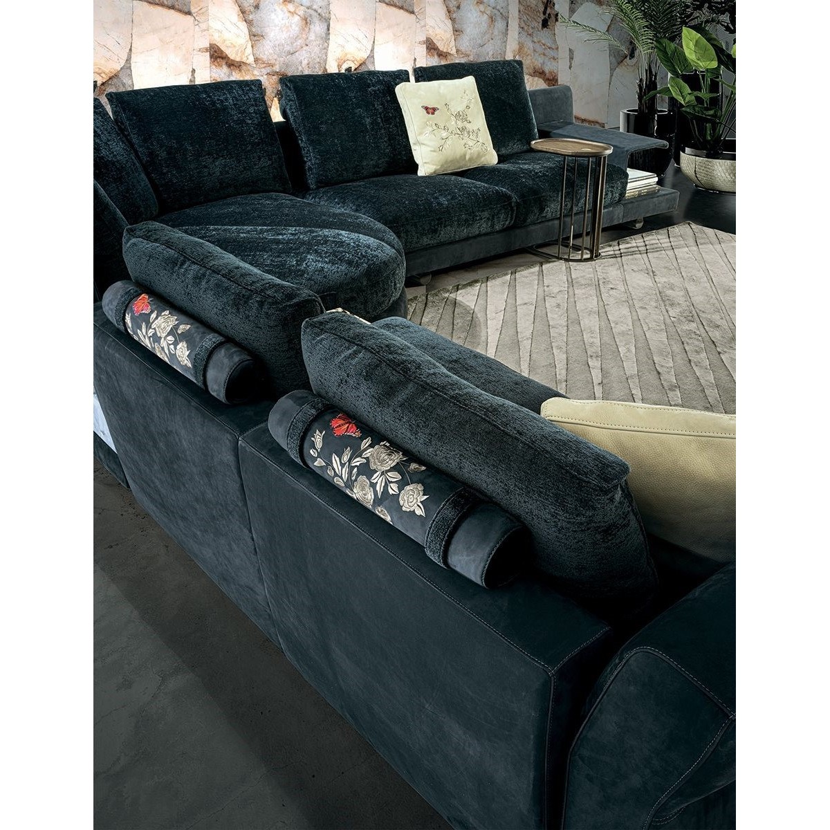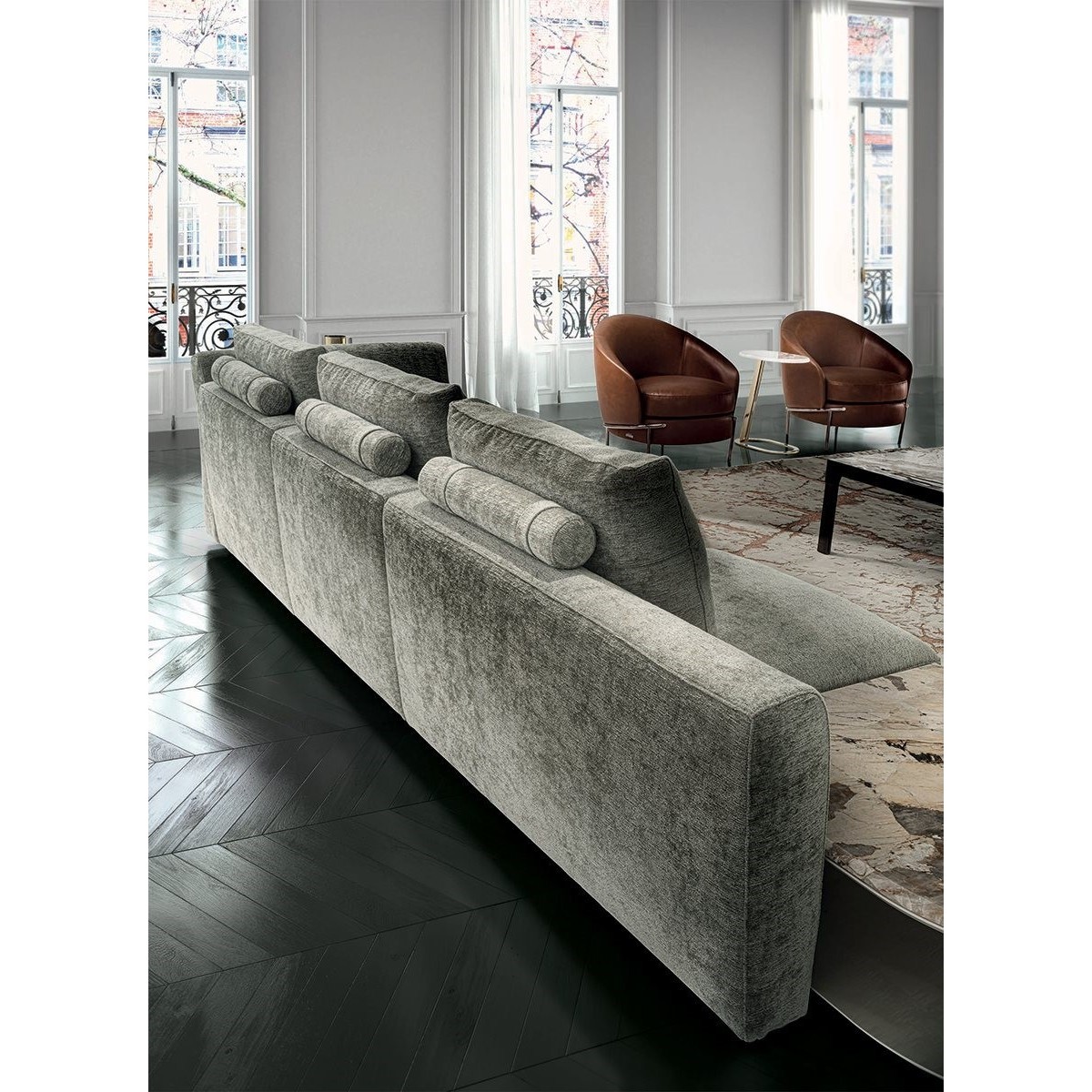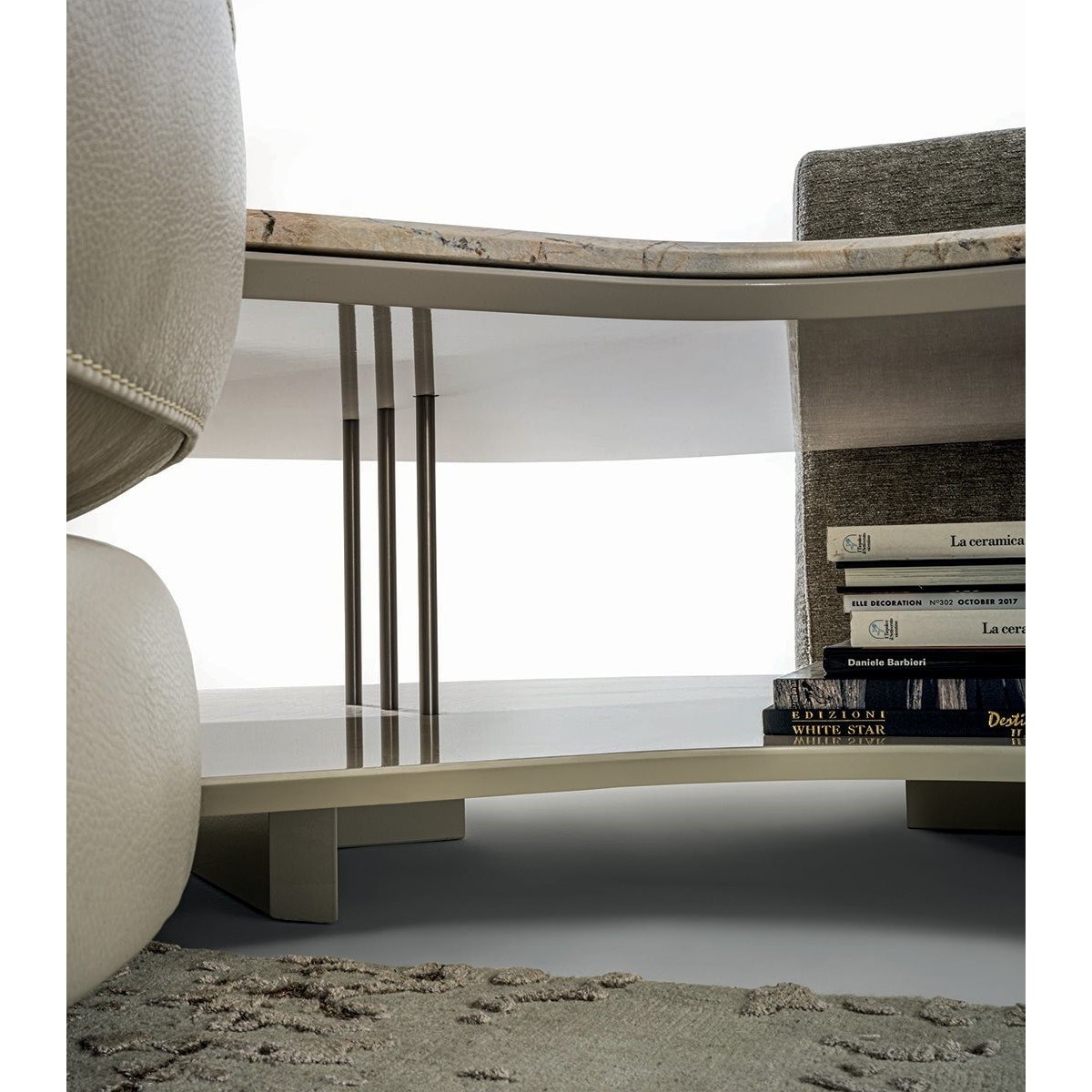 The Riverside collection contains classic linear elements and was designed to create flexible modern modular compositions that can cover every requirement of any given space. A range of dedicated complements and the option of matching different materials with a flexible selection in the measurements required complete this collection to make sure that it resolves every design requirement. The structure is in wood with high-resistance elastic bands, covered in high density polyurethane foam. Seat cushions are in multi-density polyurethane foam interiors with a rounded outer Memory Foam layer, all encased in soft sterilized goose down. Backrest cushions are filled with sterilized goose down, supported by a roller in high density polyurethane foam. On the roller upholstered in leather, it is possible to order a “Marlène” embroidered decoration. The elegant metal profile inserted in the armrest, the feet and all the metal accessories are offered in the following finishes: Satin nickel, bright shaded brown, Black Rose gold, bright light gold, matt Champagne gold, bright chrome, bright black chrome, matt satin bronze, bright pink gold, matt pink gold. The upholstery CANNOT be removed from the structure, but the cushion covers in leather or fabric are removable. Different types of dedicated small tables complete the collection: - small service table with “wing shaped“ shelf covered in smooth or perforated leather. They have the same strip design on the structural base, and offer a refined solution for holding objects and also for storage. - small table in boxed in onyx and or Patagonia marble backlit. - small end table round in marble or mirror from the catalogue, base in wood: glossy/matt Maple, glossy/matt heat-treated Eucalyptus, glossy/matt Sycamore frisè, glossy/matt Ebony,Canaletto walnut stained gloss/matt Macadamia and support columns Ø 14 mm in coordinated metal. - shaped small table in marble or mirror from the catalogue, base in wood: glossy/matt Maple, glossy/matt heat-treated Eucalyptus, glossy/matt Sycamore frisè, glossy/matt Ebony, Canaletto walnut stained gloss/matt Macadamia and support columns Ø 14 mm in coordinated metal.